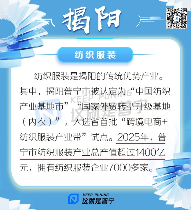据南方+报道:1月15日,“广货行天下”春季行动正式启动,广东正以更强劲的态势,推动更多优质广货走向全国、闪耀世界。其中南方+报道:2025年普宁市纺织服装产业总产值超过1400亿元,拥有纺织服装企业7000多家,让我们来了解一下: