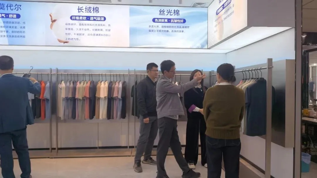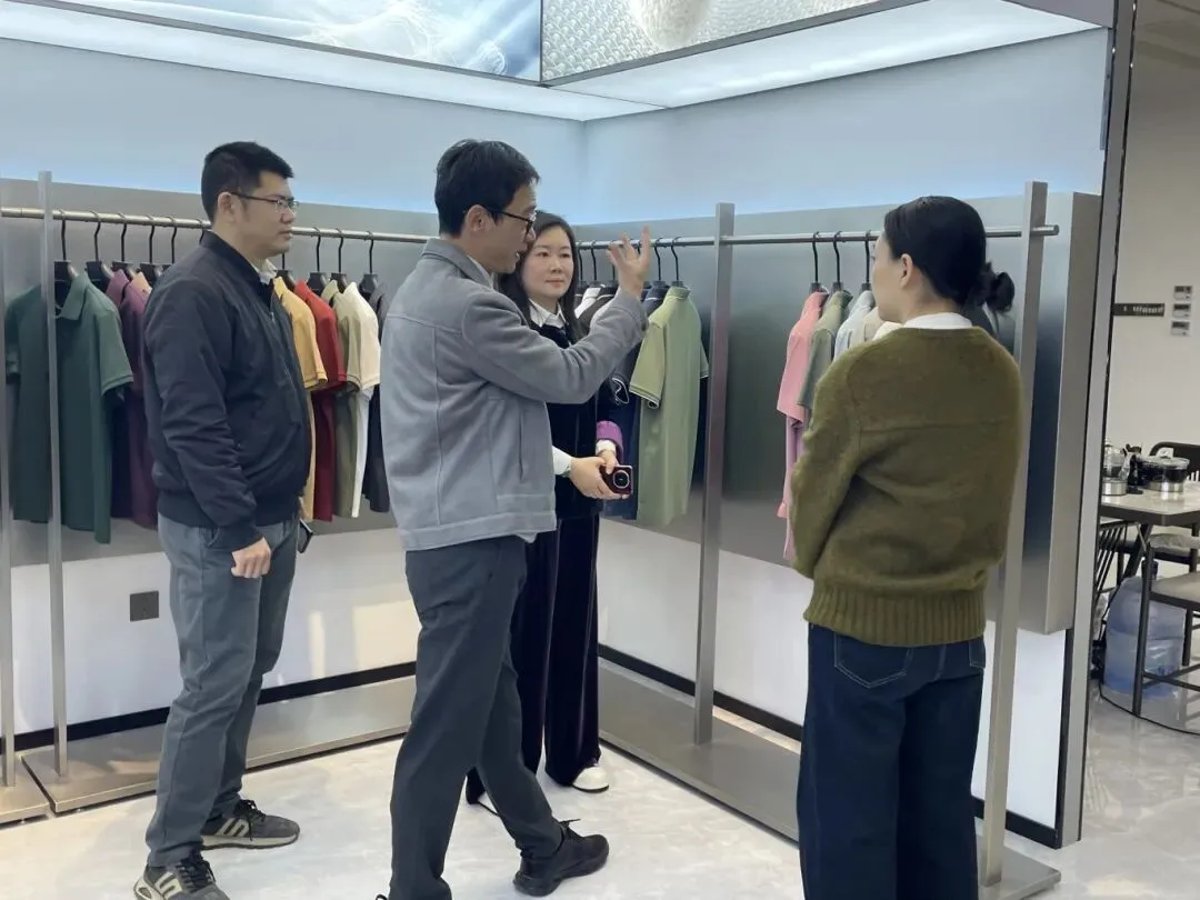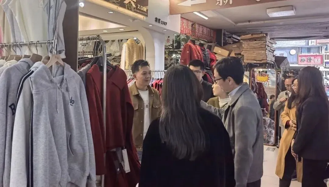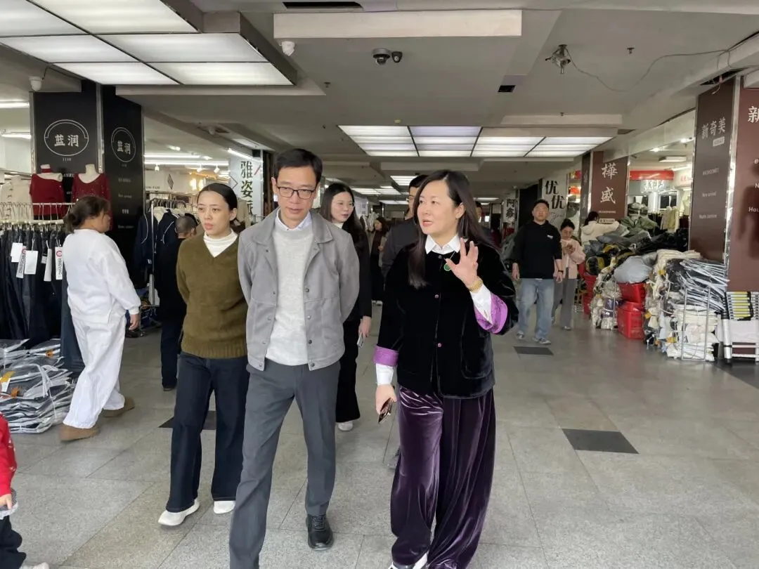 调研组认真听取了普宁服装详细介绍。随后,一行人深入服装城多个区域进行实地参观考察,先后走访了主楼四楼电子商务园的“创梦”公司、五楼精品男装服饰中心以及旋转商城等地。在电子商务园区,“创梦”公司所展现的一站式供应链模式引发了调研组的浓厚兴趣。