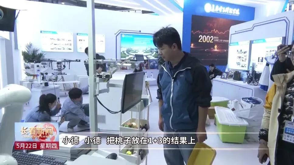 位于C馆的东北振兴专区内,长春电子科技学院正在展示梅卡曼德机器人的功能。用语音对它发出指令,它就能在无规则放置的物体模型中自动识别出您需要它抓取的物体,精准抓取并放置到指定位置。听起来很简单,但它融合了多模态大模型、成像算法、AI识别算法、光机电核心器件等多项技术,并已经在多个领域大显身手。