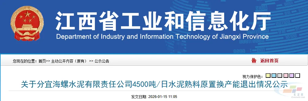 1月15日,江西省工业和信息化厅发布关于分宜海螺水泥有限责任公司4500吨/日水泥熟料原置换产能退出情况公示,公示日期:2026年1月15日-2026年1月21日。