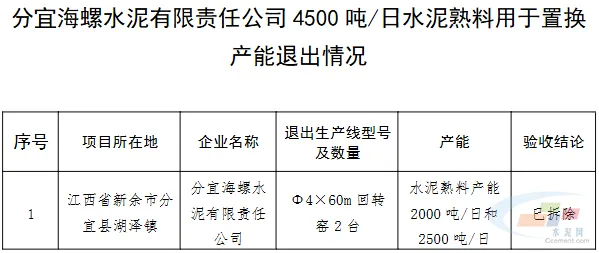 根据水泥玻璃行业产能置换相关文件要求,江西省工业和信息化厅于2023年11月对分宜海螺水泥有限责任公司4500吨/日水泥熟料(拆二合一/迁建)项目产能进行了公告。现用于分宜海螺水泥有限责任公司4500吨/日水泥熟料产能置换的该公司2000吨/日水泥熟料生产线、2500吨/日水泥熟料生产线已按要求进行了拆除,不具备水泥熟料生产条件,并通过现场核查验收,现予以公示。