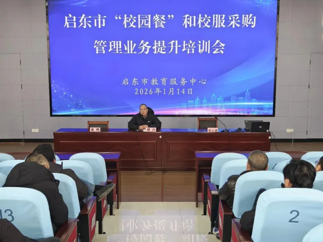 为进一步规范学校后勤管理工作,提升“校园餐”安全保障水平与校服采购管理规范化程度,切实守护师生切身利益,1月14日,由启东市教育服务中心主办、启东市和合小学承办的“校园餐”和校服采购管理业务提升培训会(寅阳站)顺利召开。启东市东部片区各中小学、幼儿园的食堂管理员及校服采购负责人齐聚启东市和合小学,共同参与本次业务提升培训。会议由启东市教育服务中心食宿安全管理科科长林小健主持。