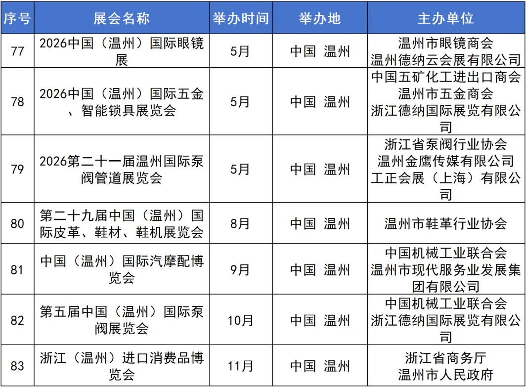 为引导支持全市外贸企业开拓国际市场,温州市商务局在充分征求相关部门、外贸企业、行业商(协)会等意见的基础上,形成了《温州市 2026 年度市级国际性重点展会目录》,现将该目录予以公布。