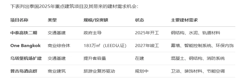 基建驱动需求:政府推动东部经济走廊(EEC)二期(77个项目,投资3400亿泰铁)、中泰高铁(二期2025年开工)、机场扩建等基建项目,拉动建材需求。
