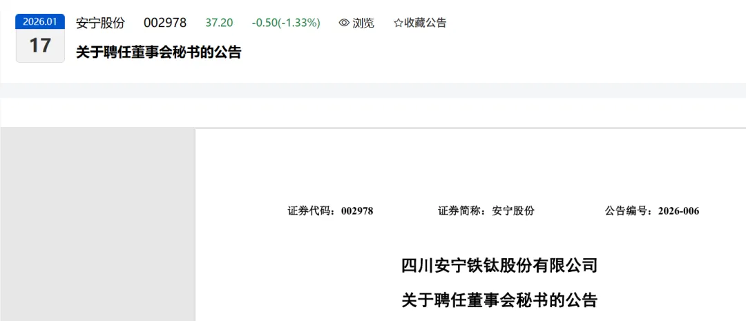 四川安宁铁钛股份有限公司(以下简称“公司”)于2026年1月16日召开了第六届董事会第三十一次会议,经提名委员会资格审查,审议通过了《关于聘任董事会秘书的议案》,同意聘任杨骏威先生为公司董事会秘书(简历详见附件),任期自本次董事会审议通过之日起至公司第六届董事会任期届满之日止。