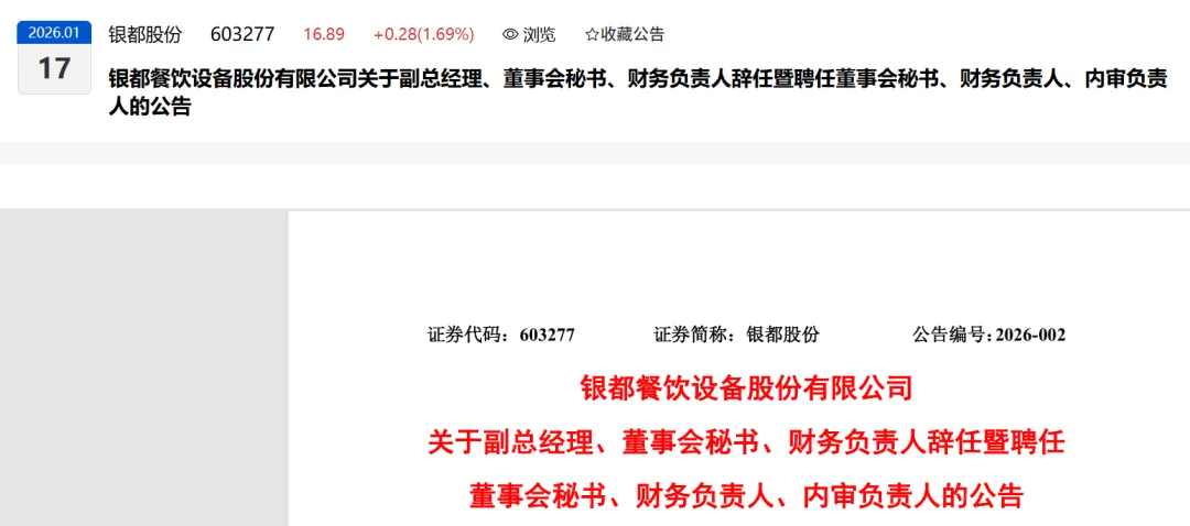 银都餐饮设备股份有限公司(以下简称“公司”)董事会收到副总经理、董事会秘书鲁灵鹏先生、财务负责人王芬弟女士提交的书面辞任报告。因工作调整,鲁灵鹏先生辞去副总经理、董事会秘书职务;王芬弟女士辞去财务负责人职务,辞任自2026年1月16日起生效。辞任后,鲁灵鹏先生、王芬弟女士继续在上市公司任职。鲁灵鹏先生调任投资部总经理,负责公司投资事务;王芬弟女士调任内审负责人,负责公司内部审计事务。