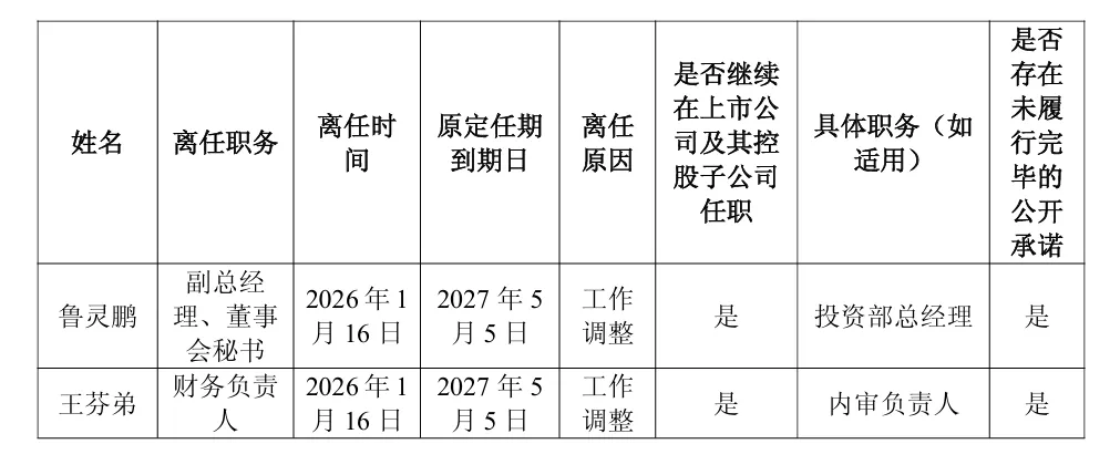 经公司董事长提名并经董事会提名委员会、审计委员会审核,公司于2026年1月16日召开第五届董事会第十七次会议,审议通过了《关于变更董事会秘书、财务负责人的议案》《关于聘任内审负责人的议案》,公司董事会决定聘任王云桥先生(简历详见附件)为公司董事会秘书兼财务负责人;聘任王芬弟女士(简历详见附件)为内审负责人,任期自第五届董事会第十七次会议审议通过之日起至第五届董事会届满之日止。