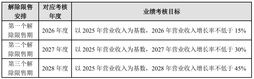 第一期(授予后 12-24 个月):解锁 20%,考核 2026 年营收增长率不低于 15%;