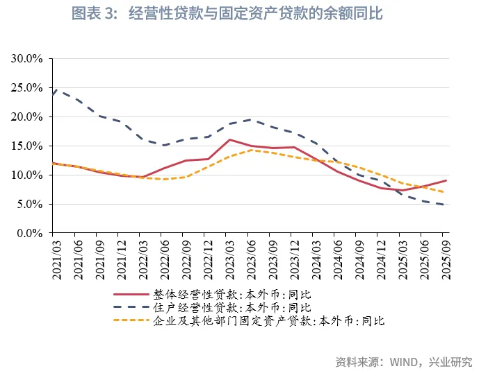 但值得关注的是,在经济大省,企业中长贷与固定资产投资的背离现象。虽然四大省份支撑2025年企业中长贷,但根据2025年前三季度的固定资产投资累计同比,广东(-14.1%)、江苏(-8.4%)、浙江(-3.8%)、山东(-3.7%)均明显低于全国平均水平-0.5%。信贷与投资的背离,或源于企业中长贷中的经营性贷款贡献愈发显著。截至2025年第三季度末,整体经营性贷款余额同比9.0%,较居民经营性贷款同比高出3.2pct,并与固定资产贷款的低迷(同比下降4.3pct至7.0%)形成对比。这些线索表明,企业中长贷中的经营性贷款增速较快,尤其是在经济大省。12月全国企业短贷同比多增3900亿元至3700亿元,也体现出企业的经营性需求。