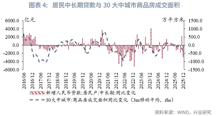 在居民信贷领域,短贷方面,国家发改委、财政部印发新一轮消费品“以旧换新”政策,将家电补贴额度由单件2000元下调至1500元,预计整体补贴力度较2025年小幅收缩,对2026年短期消费性贷款的支撑作用将较为有限。居民中长贷方面,全国住建工作会议做出“因城施策控增量、去库存、优供给”的偏谨慎表态,预计居民中长贷仍将缓慢恢复。高频数据显示,2026年初地产市场仍待提振:以1月1日至14日为区间,30大中城市成交面积录得215.9万平方米,较去年同期回落41.1%。