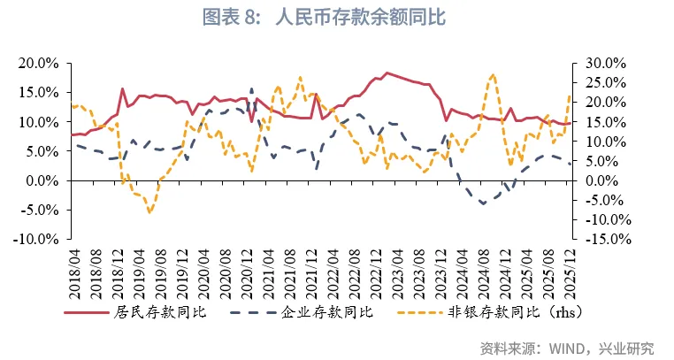 (2)M2较前月回升0.5个百分点,全年以8.5%收官。12月财政存款同比少增,但居民存款同比多增3900亿元,存款出现由政府部门向居民部门转移的迹象,支撑M2读数,企业存款增速则放缓。M1在高基数与信贷偏弱的影响下持续承压,12月录得3.8%,较前月回落1.1个百分点。