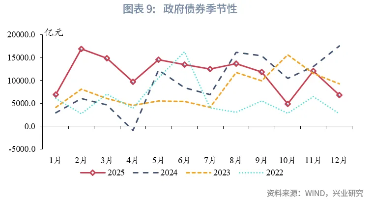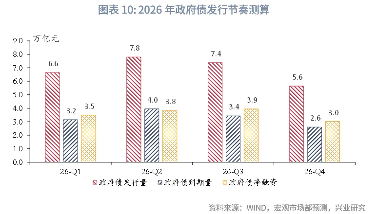 展望2026年第一季度,财政预期仍为“前置发力”,但整体净融资规模预计将较2025年同期小幅降低,结合2025年第一季度的信贷高基数,预计2026年初的社融读数将小幅下行。根据测算,2026年第一季度政府债净融资额在3.5万亿元左右,占2026年总额的24.6%,规模与占比均略低于2025年同期。