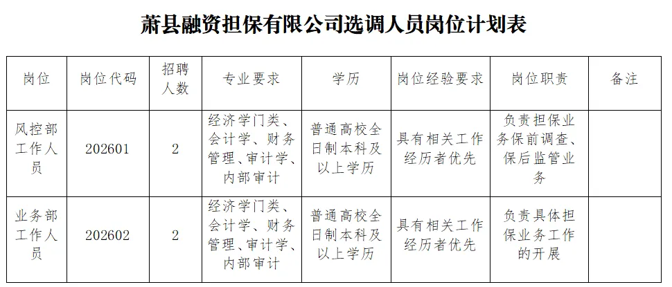 面向萧县国资委监管的县属国有企业公开选调工作人员4名。具体岗位及专业要求详见《萧县融资担保有限公司选调工作人员岗位计划表》。