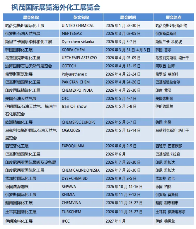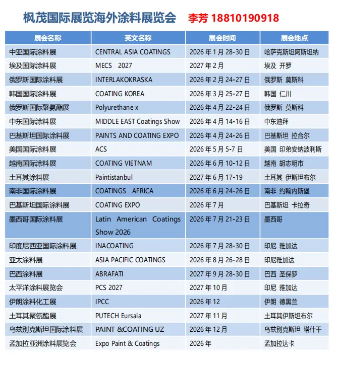 2026 海外涂料化工展会报名通道已开启!无论你想布局东南亚、非洲还是拉美市场,枫茂国际展览都能提供匹配的优质展会资源。作为专业中国区代理,我们以 “专心做事、专注服务、专业品质” 为理念,简化订展流程、保障参展效果,助力企业低成本开拓海外市场,现在咨询锁定黄金展位