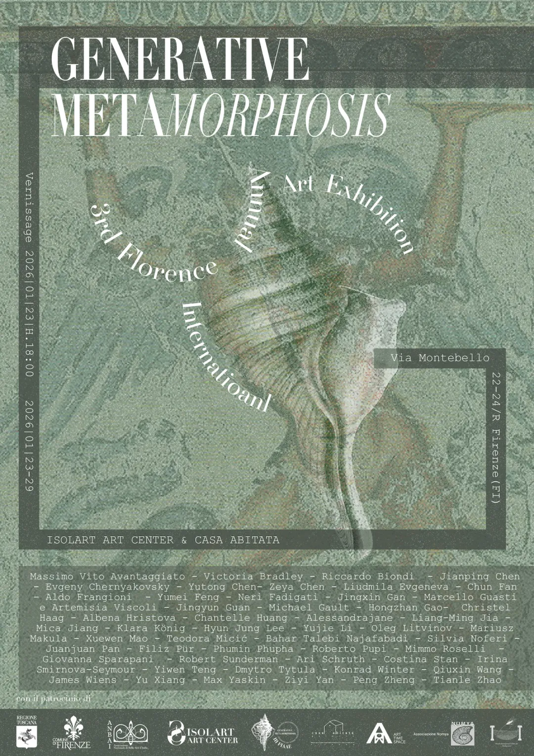 继 2025 第二届佛罗伦萨国际年度艺术展于贝里尼家族宫殿成功举办之后,2025/2026「蜕变生成」第三届佛罗伦萨国际年度艺术展(2025/2026 “GENERATIVE METAMORPHOSIS” 3rd Florence Annual International Art Exhibition)将于 2026 年 1 月 23 日在佛罗伦萨历史中心正式开幕,展期持续至 1 月 29 日。本届展览选址于佛罗伦萨历史核心地带的 CASA ABITATA,在时间层累深厚的城市空间中引入当代艺术的前沿表达,构建传统与未来之间的高强度对话场域。