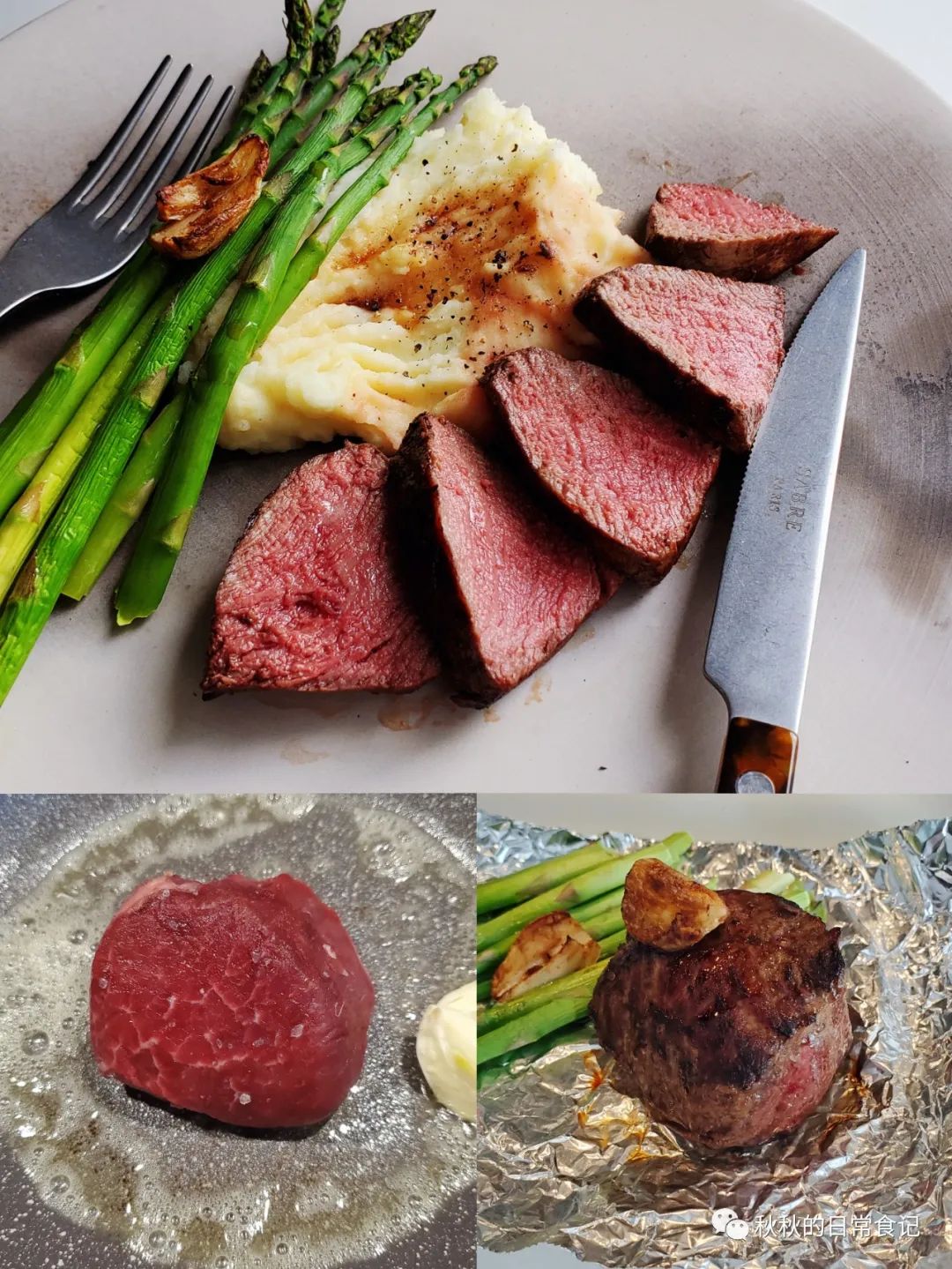 在给牛排翻面后加入一小块黄油和大蒜一起煎,更香。牛排煎好后取出静置5-10分钟,锁住水分。