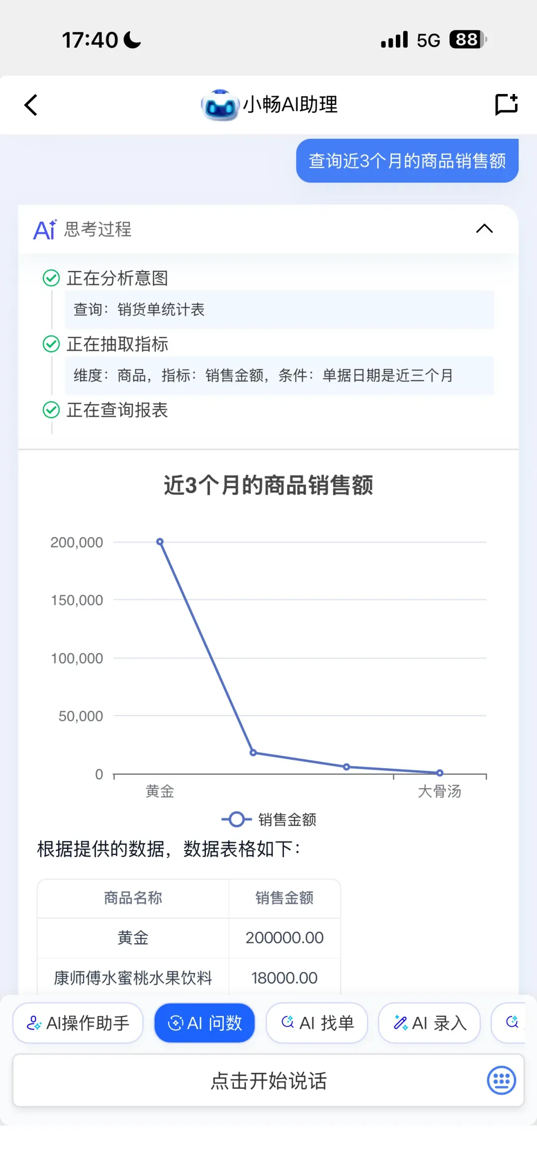 AI问数:AI问数功能支持自然语言交互,手机端与电脑端均可通过口语化提问直接获取核心业务数据。例如,销售人员只需输入“帮我查下最近三个月哪些商品卖得最好”,系统便能即时呈现精准结果。