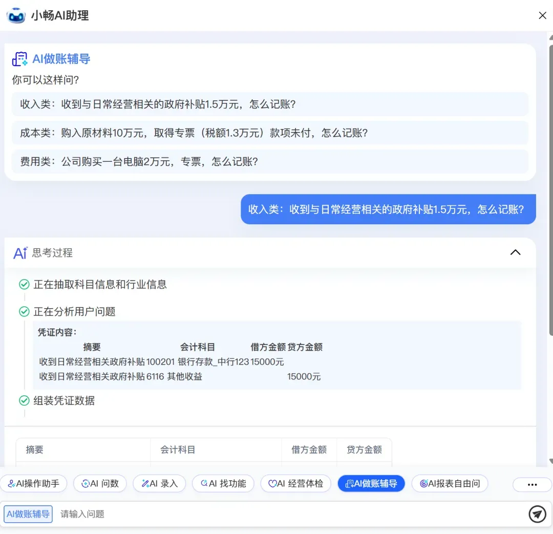 AI做账指导:财务人员常深陷于查分录、写凭证、核科目的繁琐操作。例如,当遇到“收到与日常经营相关的政府补贴1.5万元”这类业务时,AI助理可自动推送合规会计分录,并一键生成凭证,实现从查询到录入的全程智能化处理。