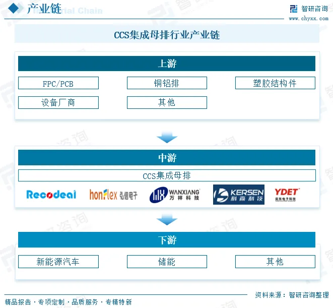 从产业链来看,CCS集成母排行业上游包括FPC/PCB、铜铝排、塑胶结构件等和设备厂商;中游是指CCS集成母排行业;下游是指应用领域,包括新能源汽车、储能等。