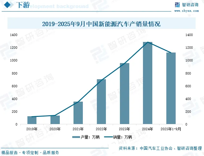 CCS集成母排在新能源汽车的动力电池中广泛应用,是新能源汽车电池包的关键部件之一。随着新能源汽车产销量攀升,CCS集成母排的需求也随之上涨。近年来,我国新能源汽车产销已连续9年稳居全球第一,成为推动全球汽车产业转型的重要力量。数据显示,2024年中国新能源汽车产销量分别完成1288.8万辆和1286.6万辆,同比分别增长34.4%和35.5%。2025年1-9月中国新能源汽车产销量持续增长,分别完成1124.3万辆和1122.8万辆,同比分别增长35.2%和34.9%。这主要受“以旧换新”政策的进一步落地和市场的不断拓展。