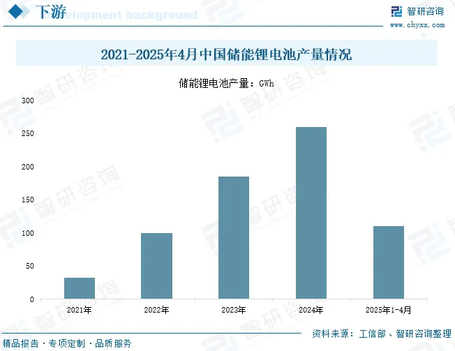 在储能领域,CCS集成母排主要用于集中管理电池组能量输出,优化电网储能系统稳定性。因此,随着储能电池产量的增加,CCS集成母排的需求量也进一步扩大。近年来,在中国新能源发电规模大幅增长的推动下,中国储能装机规模一直保持高速增长的趋势。这直接带动储能锂电池需求增长,进而推动行业产量增加。数据显示,2024年中国储能锂电池产量从2021年的32GWh增长至260GWh,2025年1-4月行业产量达到110 GWh。