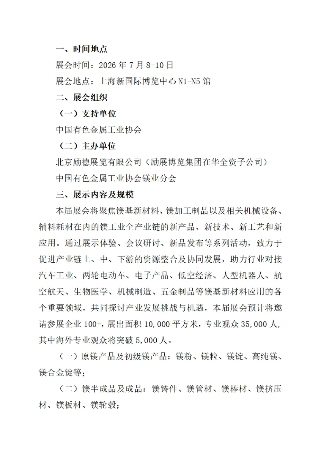 关于举办2026年上海国际镁工业展览会的通知(2026年7月8日-10日)