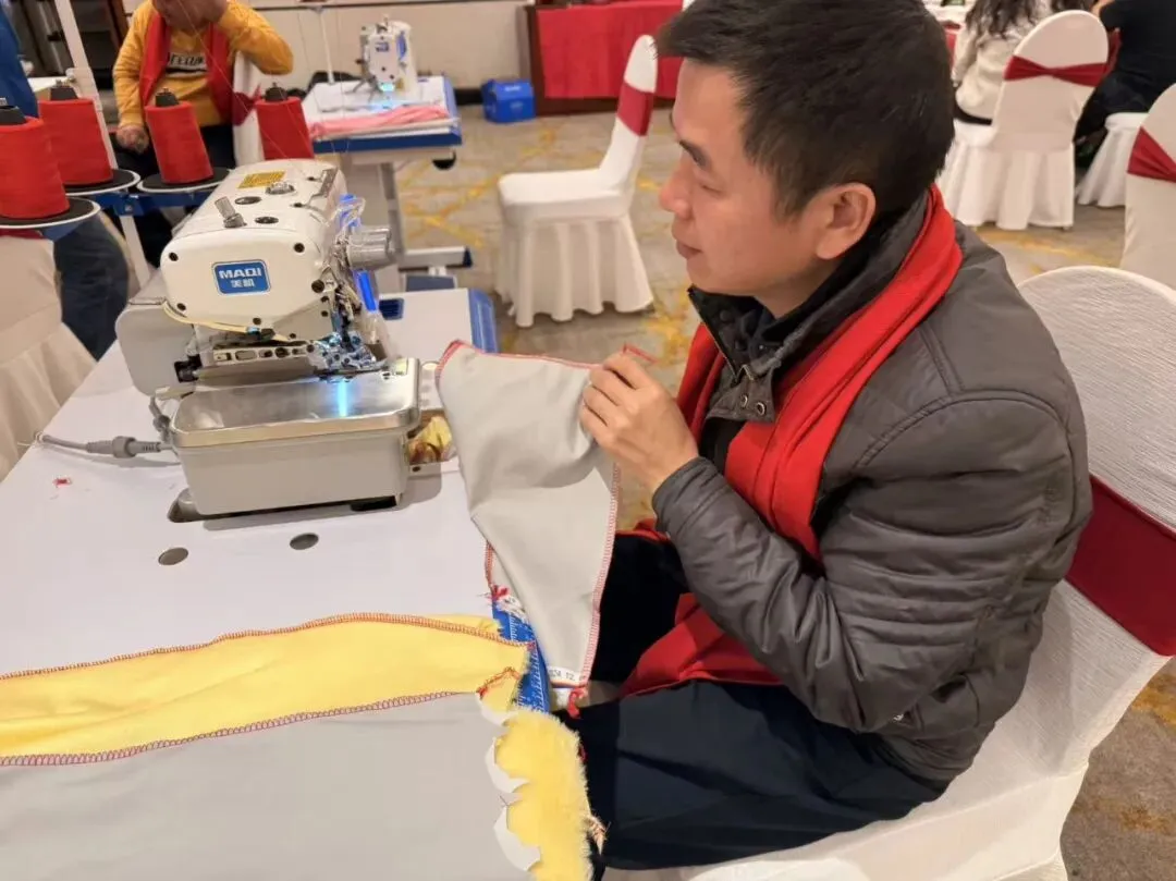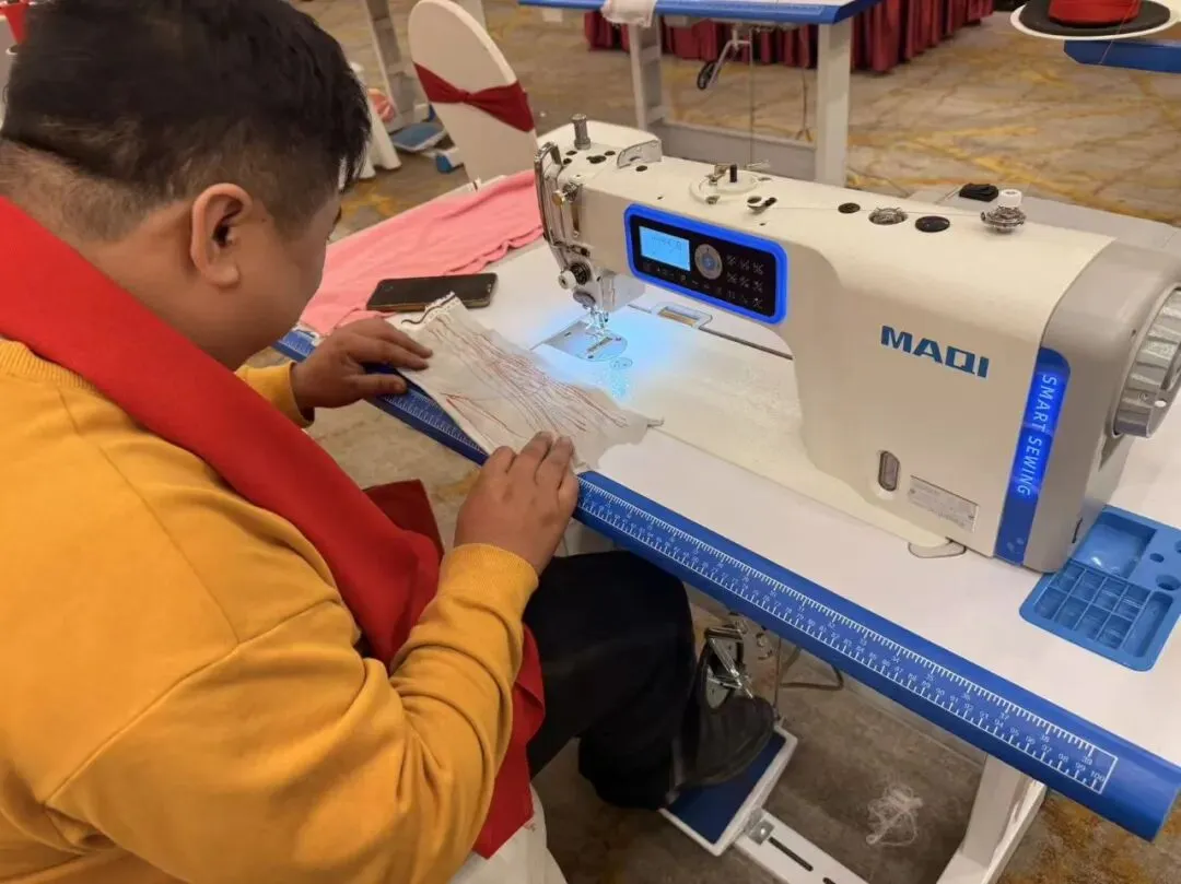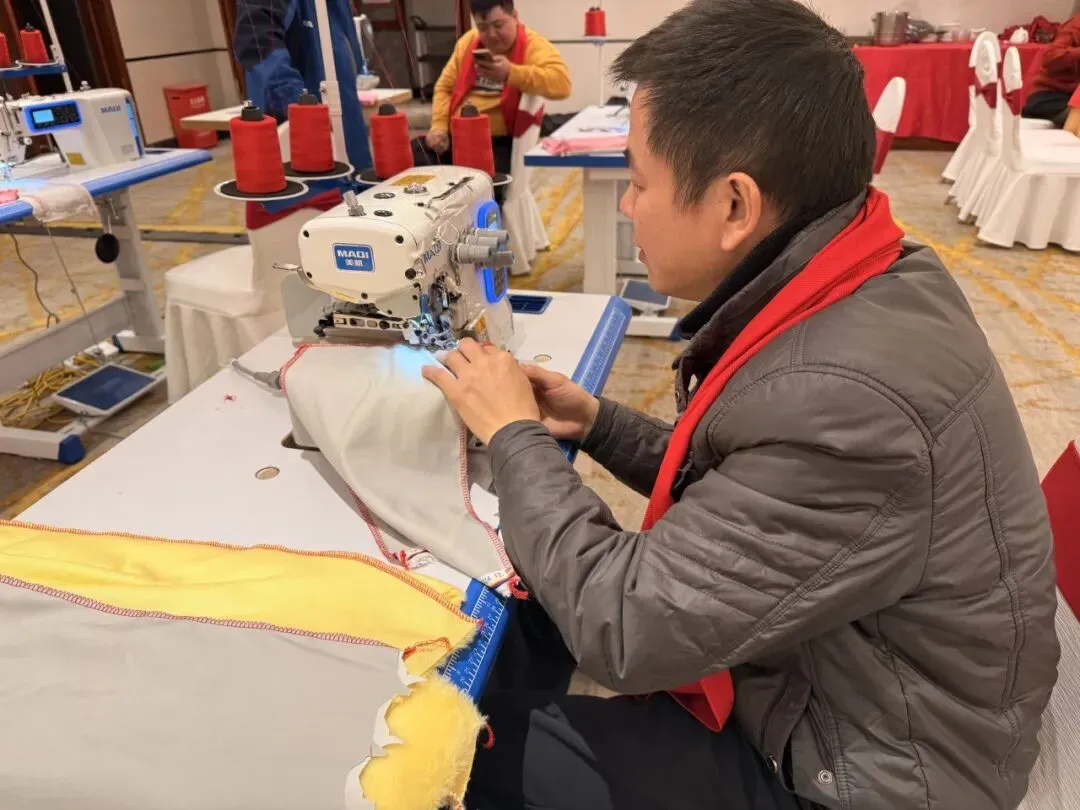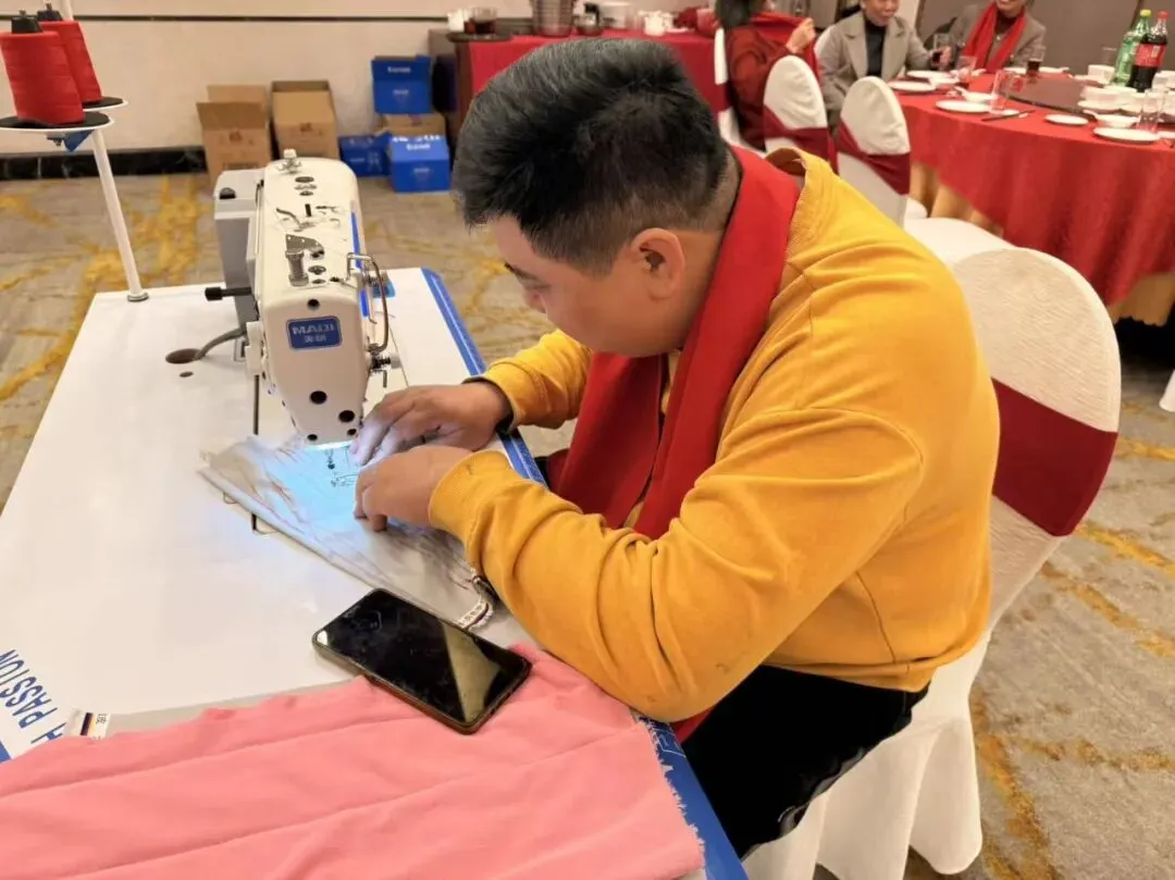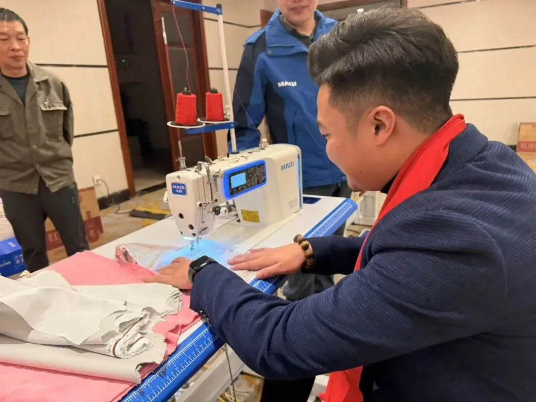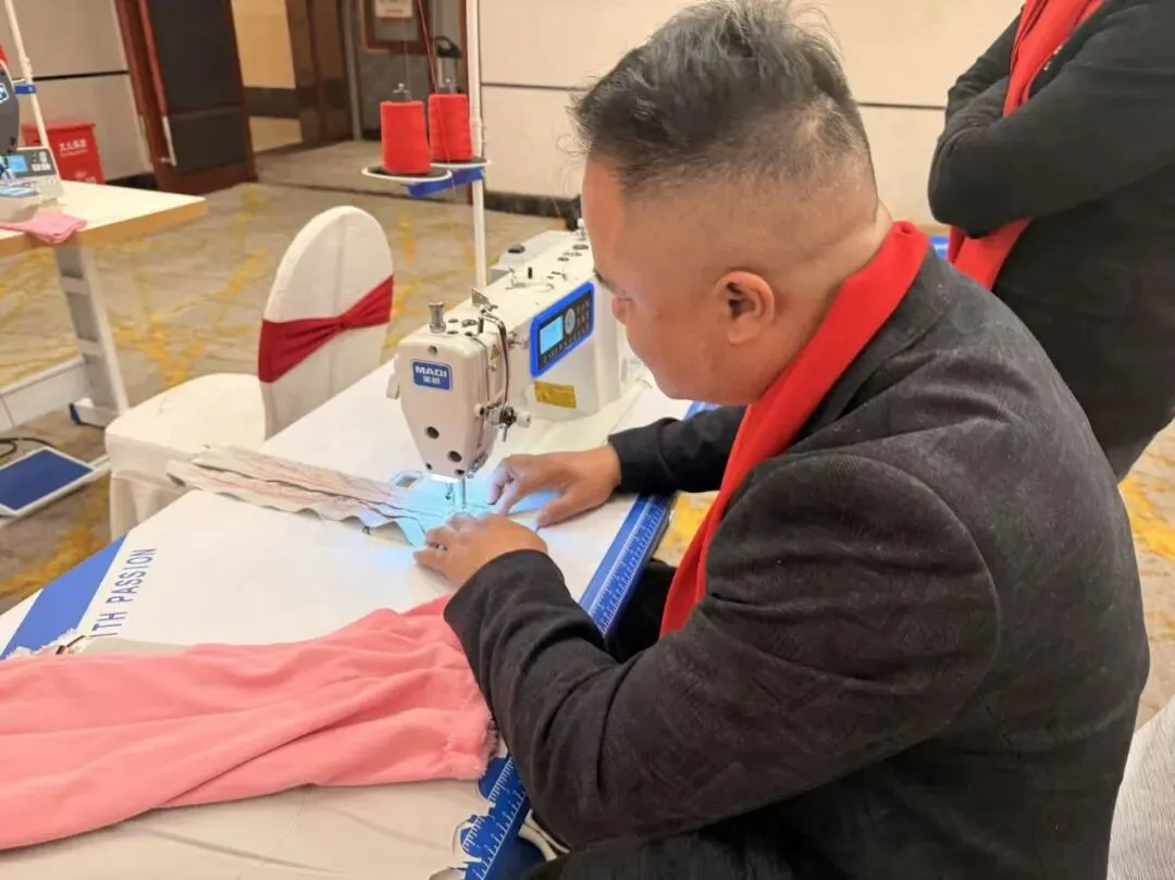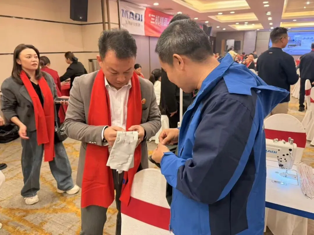 现场样机展示区人潮涌动,展示了双步进快单王Q7Ls、过坎王X10Tf、步进双驱智慧平缝机Q5Tt等多款新品。现场掀起试缝热潮,气氛热烈,多家当地头部企业代表积极参与,并对美机智能缝制设备给予高度评价。