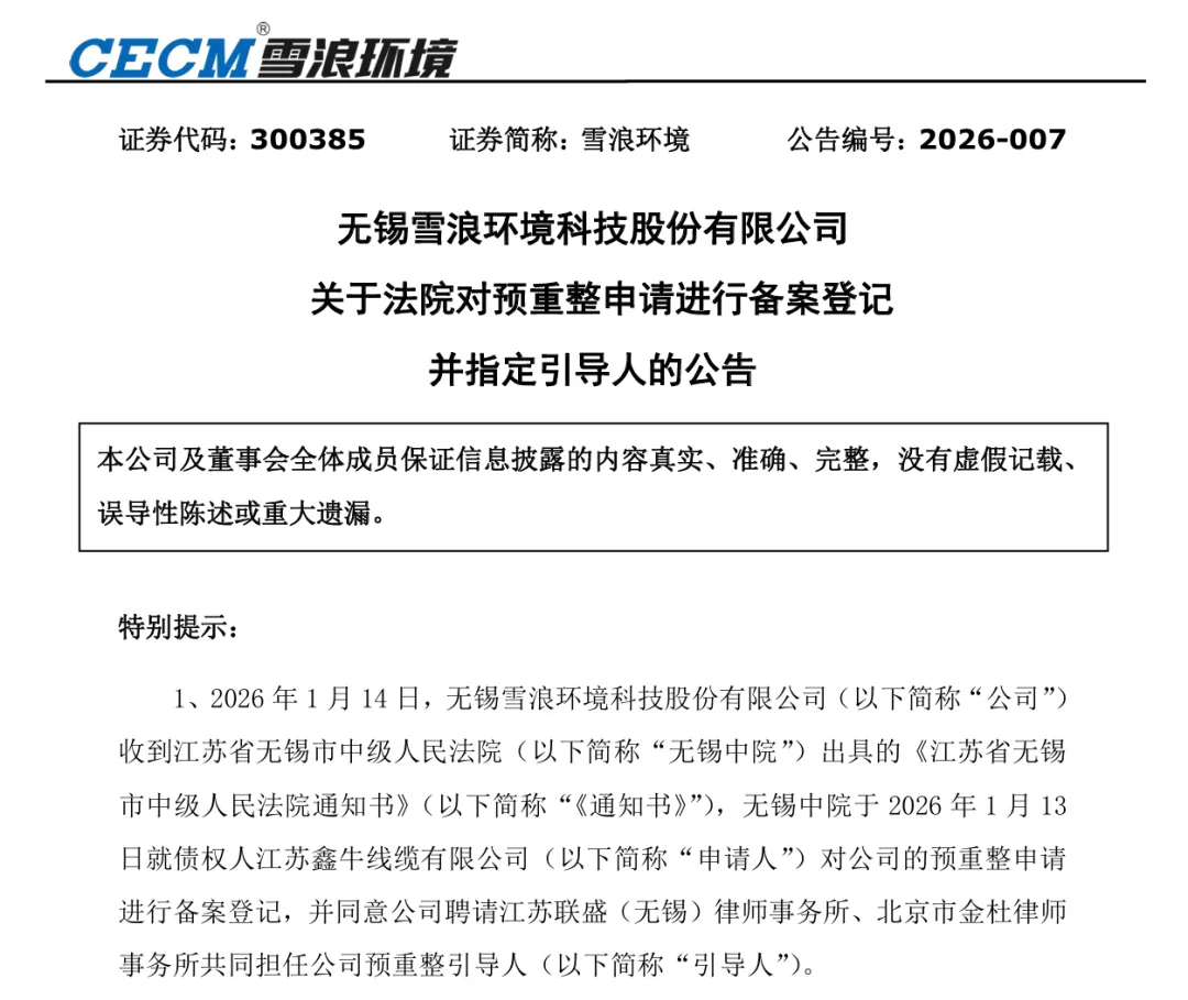 2026年1月14日,雪浪环境发布公告宣布正式启动预重整。公告显示,公司收到无锡中院送达的《通知书》,无锡中院就申请人对公司的预重整申请进行备案登记,并同意公司聘请江苏联盛(无锡)律师事务所、北京市金杜律师事务所共同担任预重整引导人,协助开展相关预重整工作。无锡中院对公司进行预重整备案登记,不代表正式受理公司重整,预重整程序是为了识别公司重整价值和重整可能,提高后续重整工作推进效率。截至本公告披露日,公司能否被法院受理重整、后续是否进入重整程序均存在不确定性。根据《创业板上市规则》相关规定,如果法院裁定受理公司重整,深圳证券交易所将对公司股票实施退市风险警示。此前,雪浪环境与1月12日发布公告,因公司被申请预重整,国家开发银行江苏省分行(以下简称“国开行”)要求提前全额偿还1.5亿元本金及利息,公司暂时无法偿还上述借款的本息,但其公司控股股东新苏环保产业集团有限公司作为共同借款人已于当日先行偿还上述1.5亿元借款本金及利息等。公开信息显示,雪浪环境是一家专注于环保领域、以烟气净化与灰渣处理为核心业务的国家级高新技术企业,成立于2001年2月12日,2014年6月26日在创业板上市,控股股东为新苏环保产业集团有限公司。据最新财报显示,2025年前三季度,雪浪环境实现营业收入约2.63亿元,同比减少33.51%;归母净利润约-1.58亿元,同比减少4.22%。