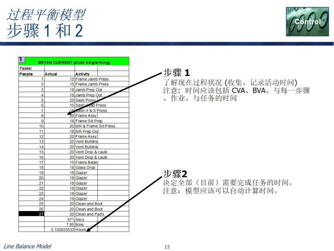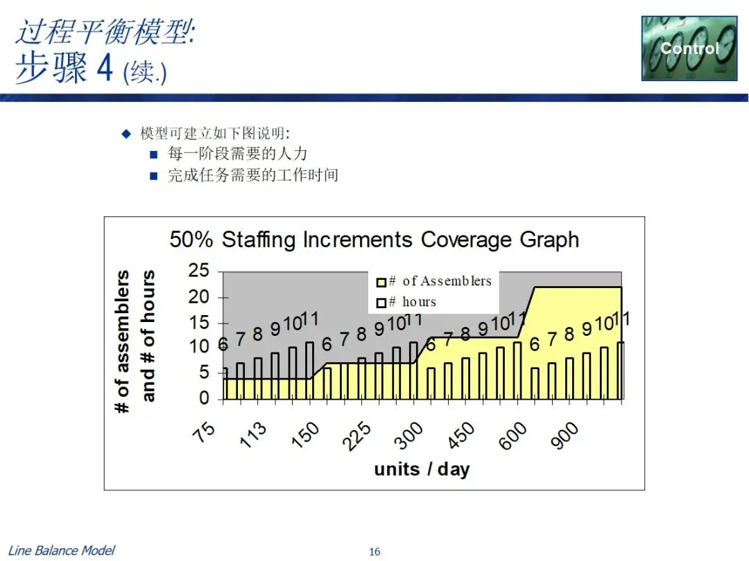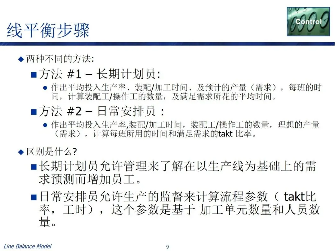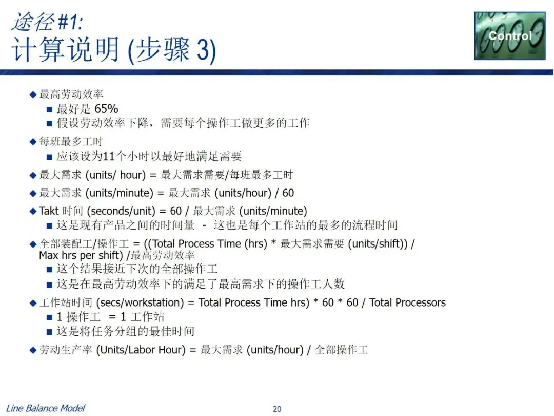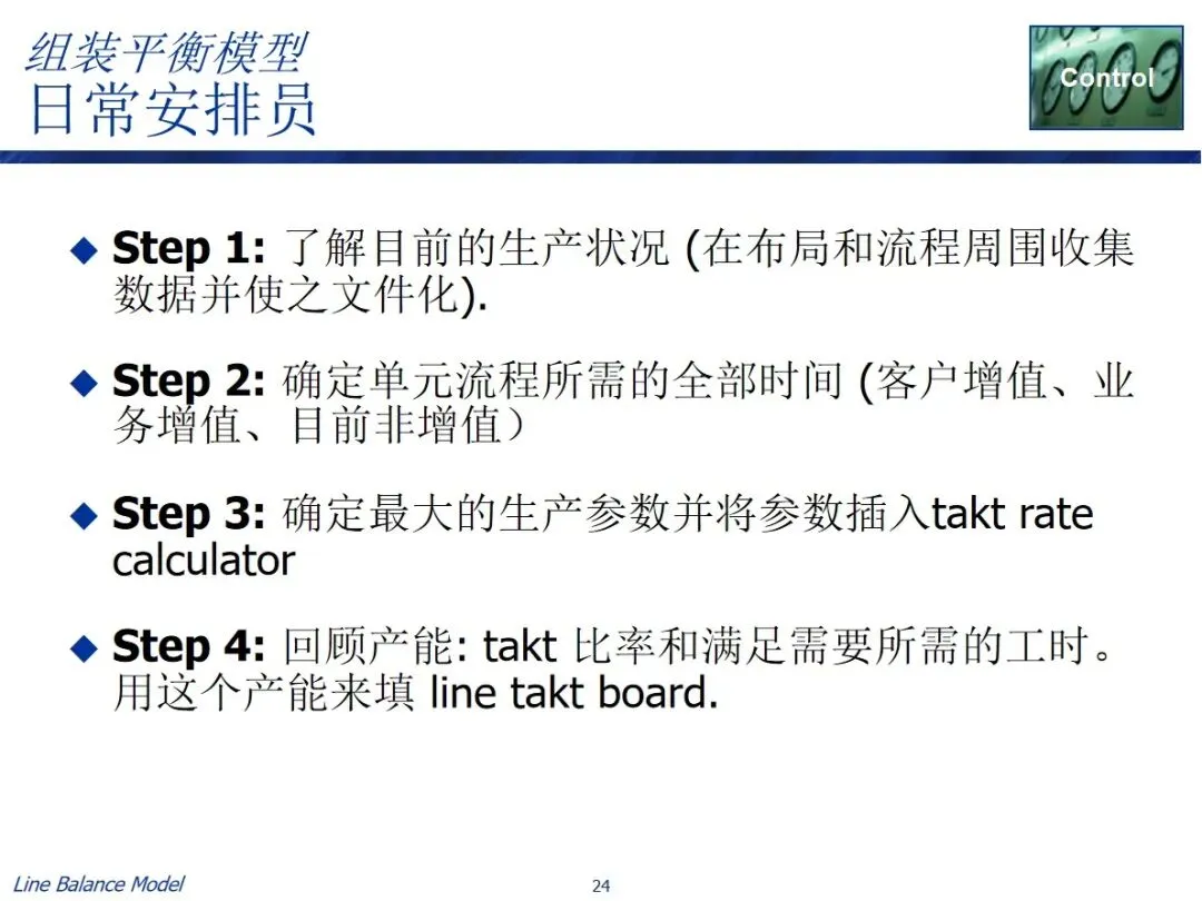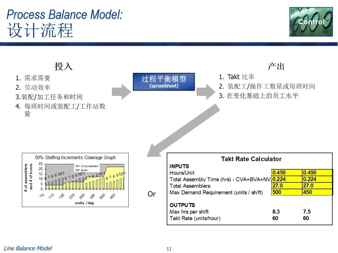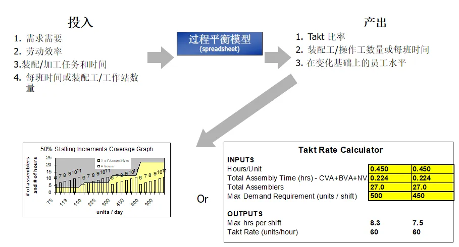 在实施过程中有两条实用的路径,一条是长期规划路径,结合预测需求、作业效率、作业时间等资料,计算出需要的作业人数和每班作业时间,从而确定长期的人员配置;每日调度器路径基于可获得的人员数目和能力参数来逆推节拍率和作业时间以引导每日的生产调度。两种方法都包含了数据采集、总工时计算、参数设置、目标匹配和任务分解的关键步骤,并利用表单工具进行了自动化操作,实现了平衡方案的可视化显示。