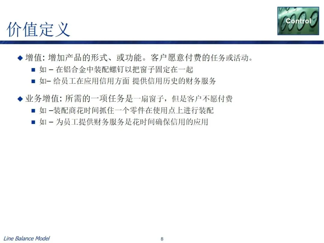 价值的界定是模式运用的基础,活动划分为两大类: 增值活动(CVA)是指能够提高产品的形式和功能,并且客户愿意为此支付一定费用的活动,例如零件组装和关键财务信用业务;业务增值(BVA)活动是流程中必须的、但不直接由客户付费的行为,例如组装过程中的部件定位和信用申请中的合规检查,该模型将重点放在这两种行为上,以减少无效和浪费。