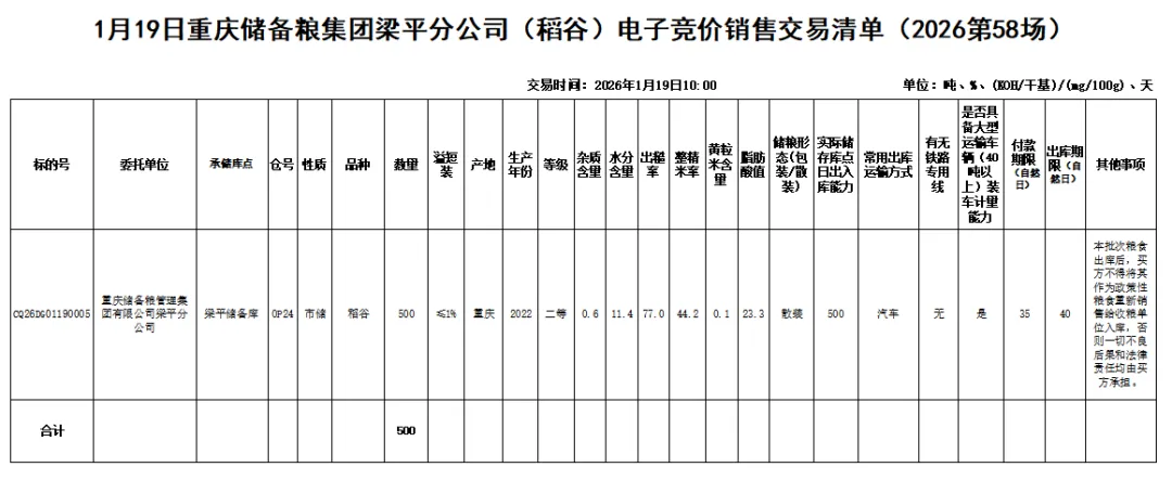 受重庆储备粮管理集团有限公司梁平分公司委托,重庆市粮油批发市场有限责任公司(即国家粮食重庆交易中心,以下简称“批发市场公司”),定于2026年1月19日10:00举办重庆储备粮集团梁平分公司(稻谷)电子竞价销售交易会,现将有关事项公告如下: