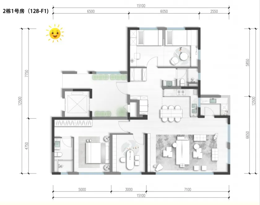 建面约128㎡的越级户型,4室2厅2卫的设计,做到111%得房率,南向面宽达15.1米,实得面积可媲美市面上143㎡新规住宅,类比170㎡以上旧规产品。