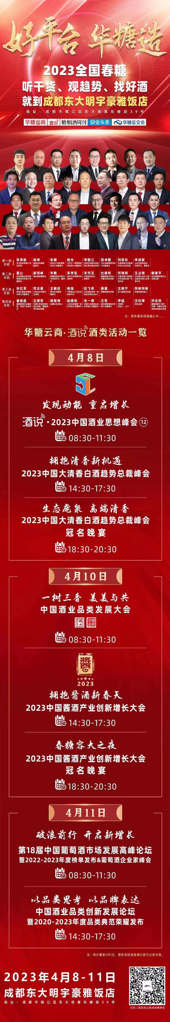 2023年第108届全国春季糖酒会期间,由华糖云商·酒说主办的多场酒类活动将于4月8日-4月11日在成都东大明宇豪雅饭店举行。具体活动主题与日期详情见下图: