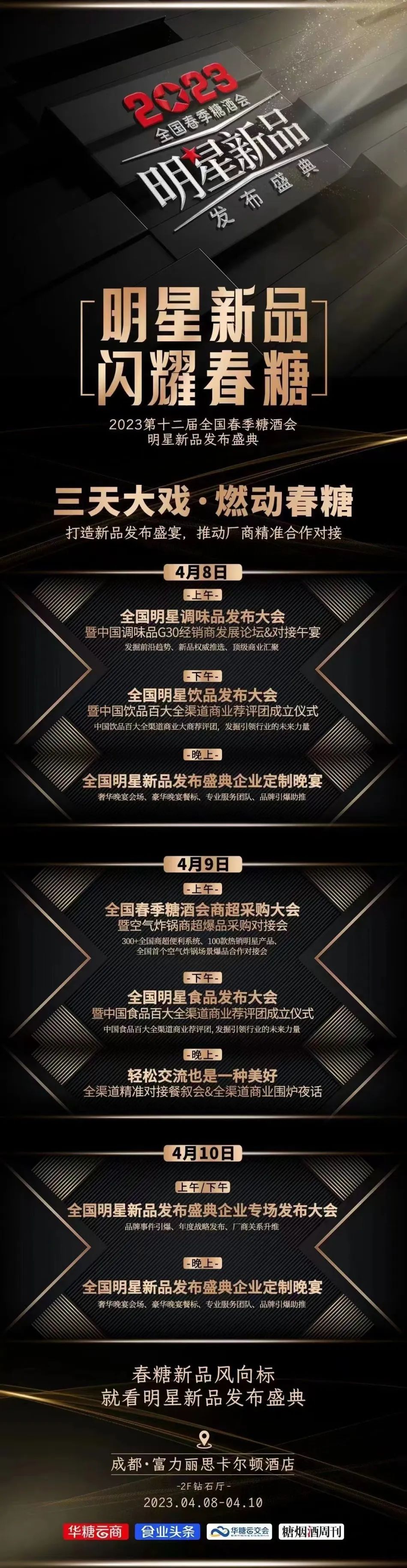 2023年4月9日下午,由全国糖酒会办公室指导,华糖云商和食业头条发起主办的“2023全国糖酒会明星新品发布盛典”(食品场)将于成都·富力丽思卡尔顿酒店举行。三天大戏·燃动春糖,打造新品发布盛宴,推动厂商精准合作对接。