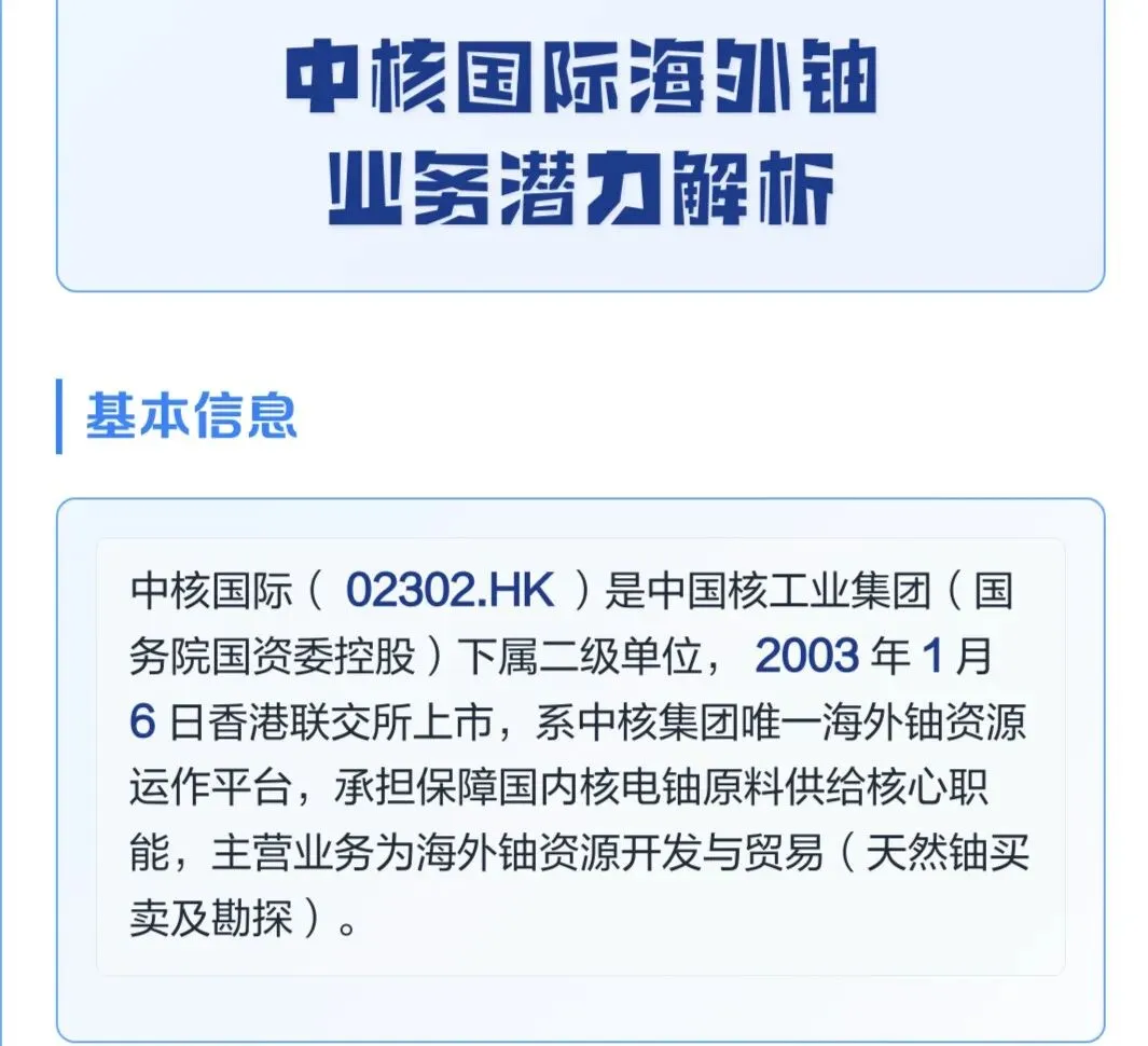 业务范围:海外铀资源。作为中核集团的海外铀资源投融资平台,主要从事海外天然铀资源的开发和贸易。