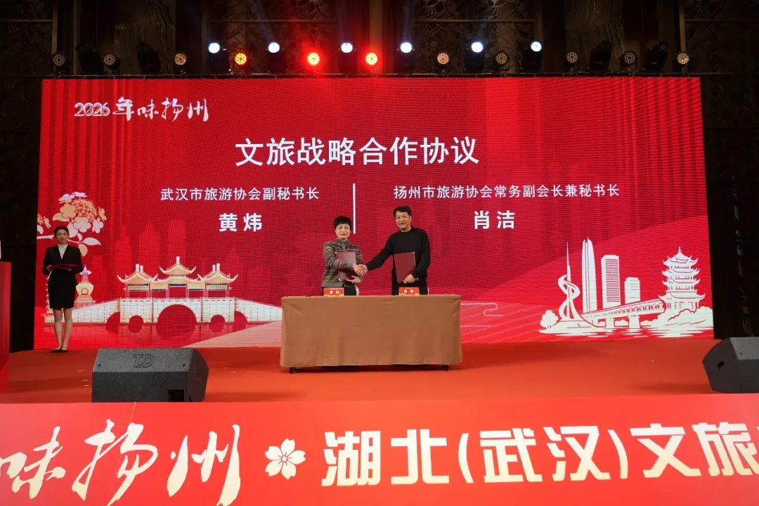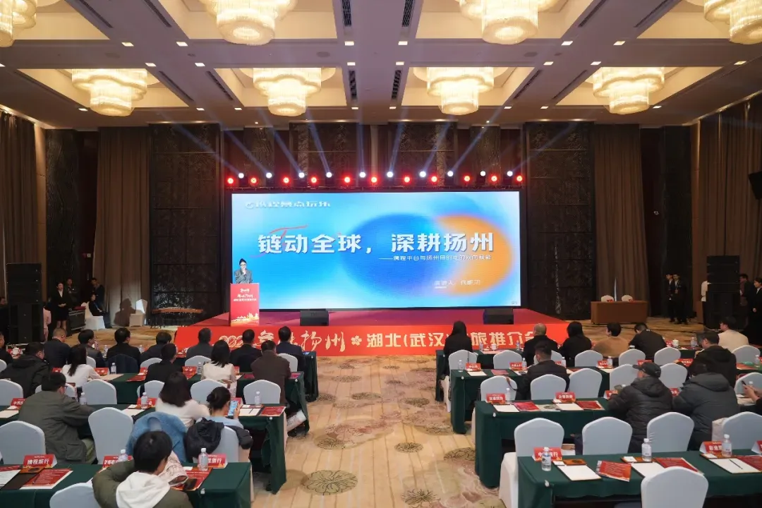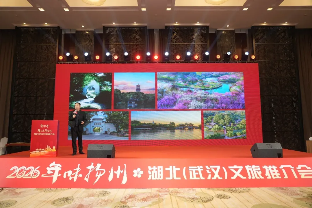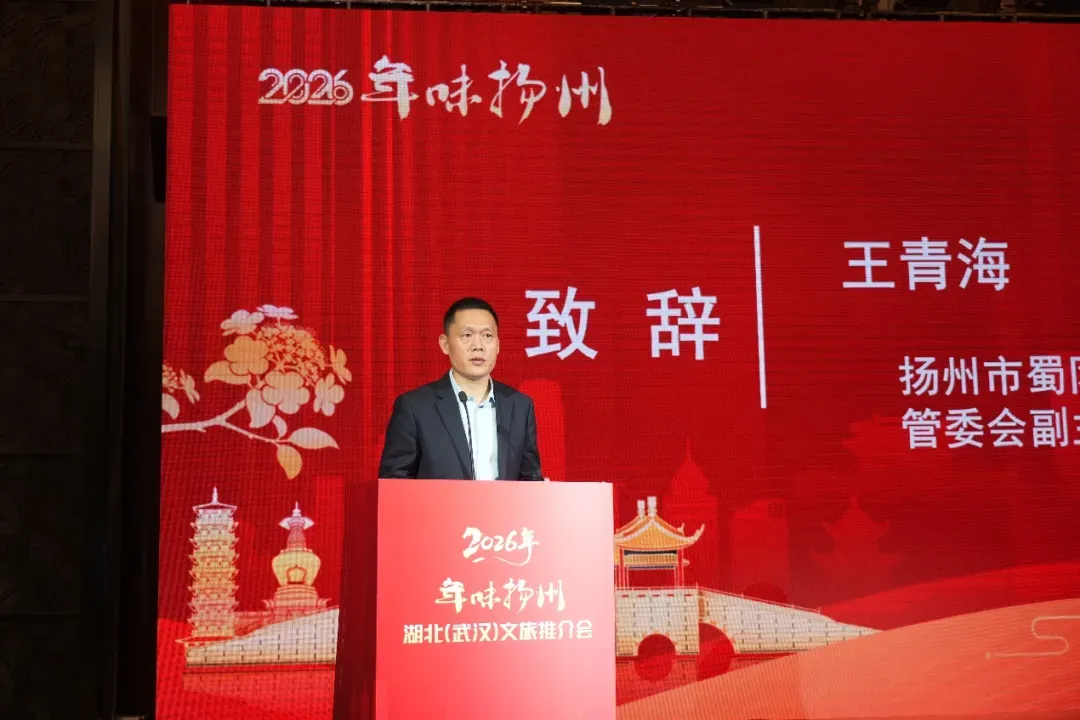 1月16日,2026“年味扬州”湖北(武汉)文旅推介会在武汉成功举办,扬州文旅魅力在荆楚大地精彩绽放。武汉市文化和旅游局党委委员、副局长刘兴元,湖北省旅游协会旅行社车船分会、导游分会会长陶颀,武汉市黄鹤楼公园管理处副主任卢其星,武汉市旅游协会副秘书长黄炜;扬州市蜀冈-瘦西湖风景名胜区党工委书记刘卫国,党工委委员、管委会副主任王青海出席推介会。湖北、武汉80余家旅行社、景区景点负责人,国内头部OTA企业代表,以及新闻媒体代表参加活动。活动由扬州市蜀冈-瘦西湖风景名胜区管理委员会、扬州大运河文化旅游度假区管理办公室主办,扬州市蜀冈-瘦西湖风景名胜区园林景区发展中心承办。