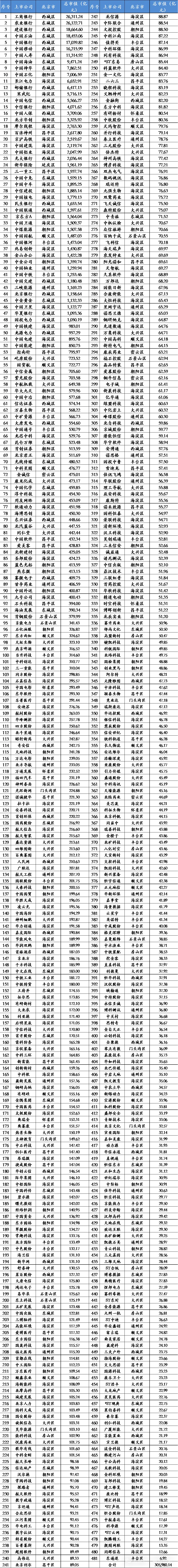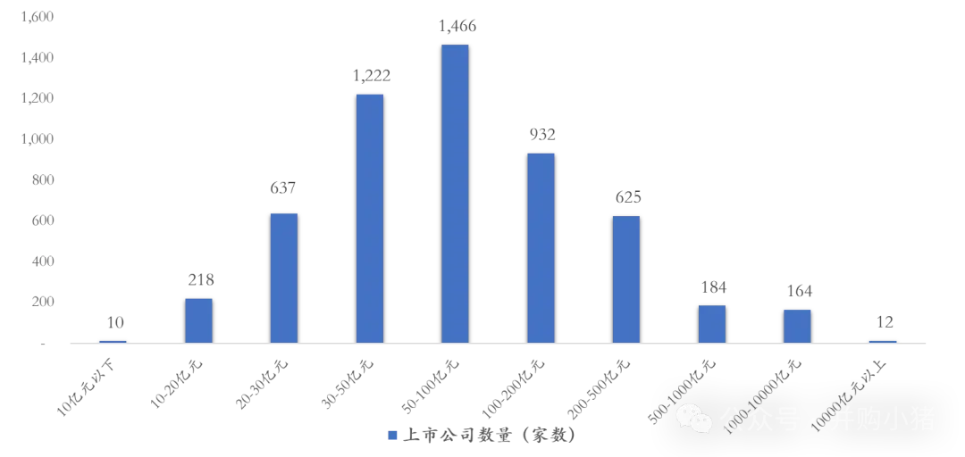 市值分布方面:A股上市公司总市值普遍较小,市值低于100亿元公司共有3553家,其中市值低于30亿元达865家(北交所212家)。
