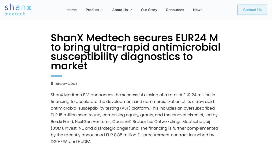 ShanX Medtech公司日前宣布已成功完成2400万欧元(约1.95亿人民币)融资,加速其超快速抗菌药物敏感性检测(AST)平台的开发与商业化进程。