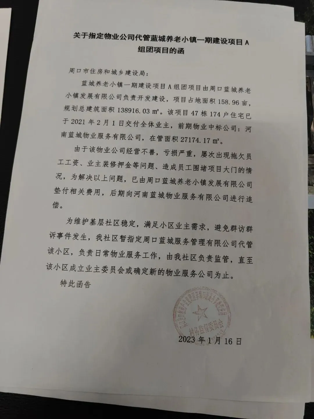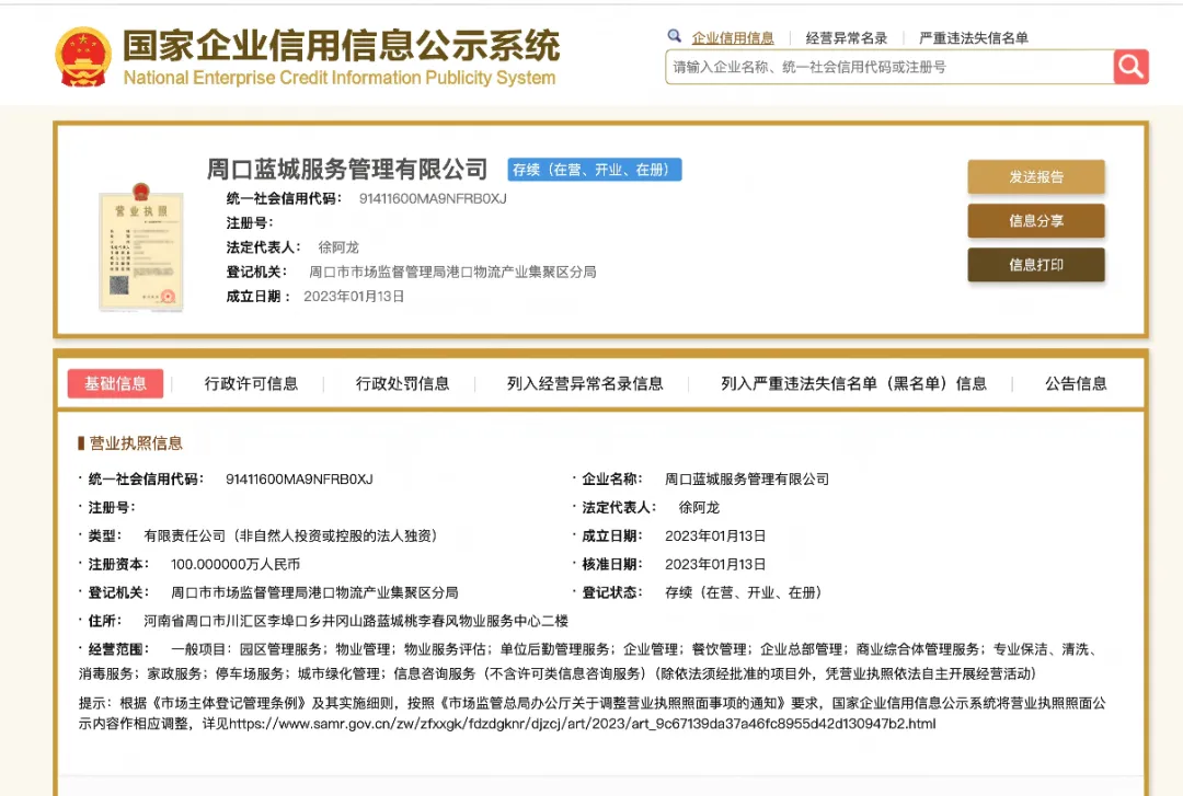 周口蓝城服务管理有限公司,2023年1月13日成立。1月16日,由村监督委员会违规指定入驻。2023年5月30日,补充招标手续。