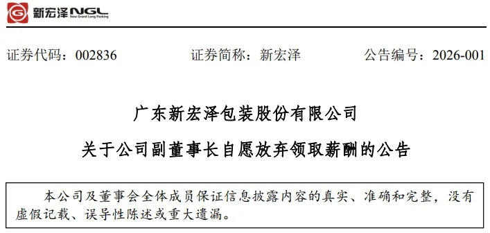 近日,广东新宏泽包装股份有限公司发布公告称,公司收到副董事长孟学女士出具的《关于自愿放弃领取薪酬的声明书》。具体情况公告如下: