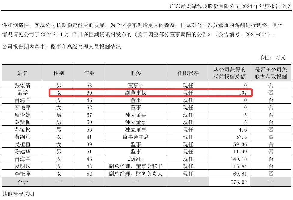 值得一提的是,孟学与公司董事长张宏清是夫妻关系,夫妇二人通过亿泽控股有限公司间接持有广东新宏泽包装股份有限公司超过60%的股权。广东新宏泽包装股份有限公司于2016年底登陆深交所主板上市,但2016年至2024年间,除2024年外,孟学其余年度均未领取薪酬,张宏清更是一直未从上市公司领取过报酬。