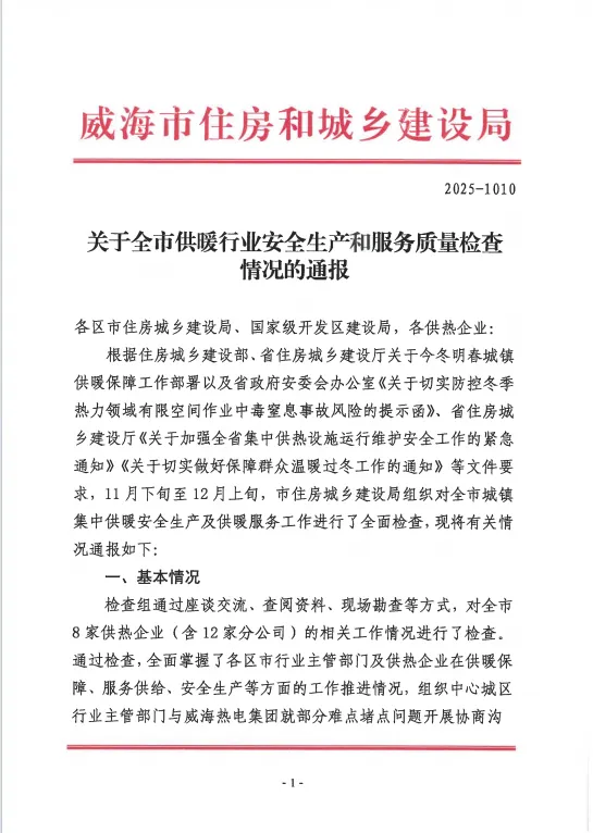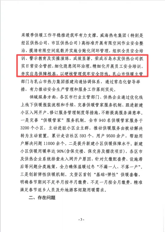 近日,威海市住房和城乡建设局通报2025年全市供热行业安全生产测评结果,荣成石岛供热公司凭借优异表现获通报表扬。