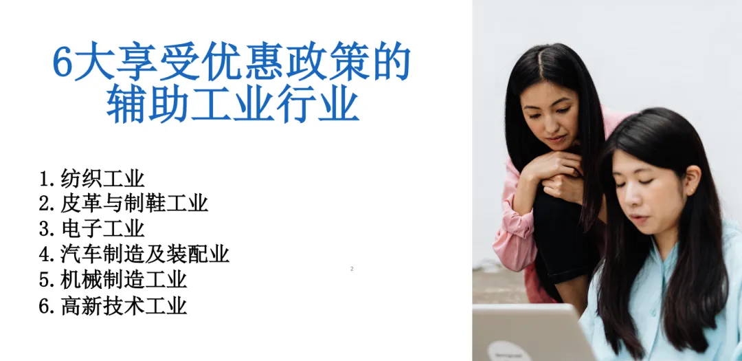 根据越南相关政策,以下六大辅助工业行业的企业可申请企业所得税减免: