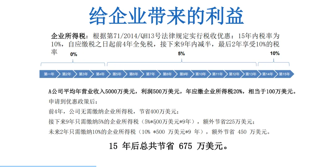 依据越南第71/2014/QH13号法律规定,符合条件的企业可享受为期15年的企业所得税优惠,具体如下: