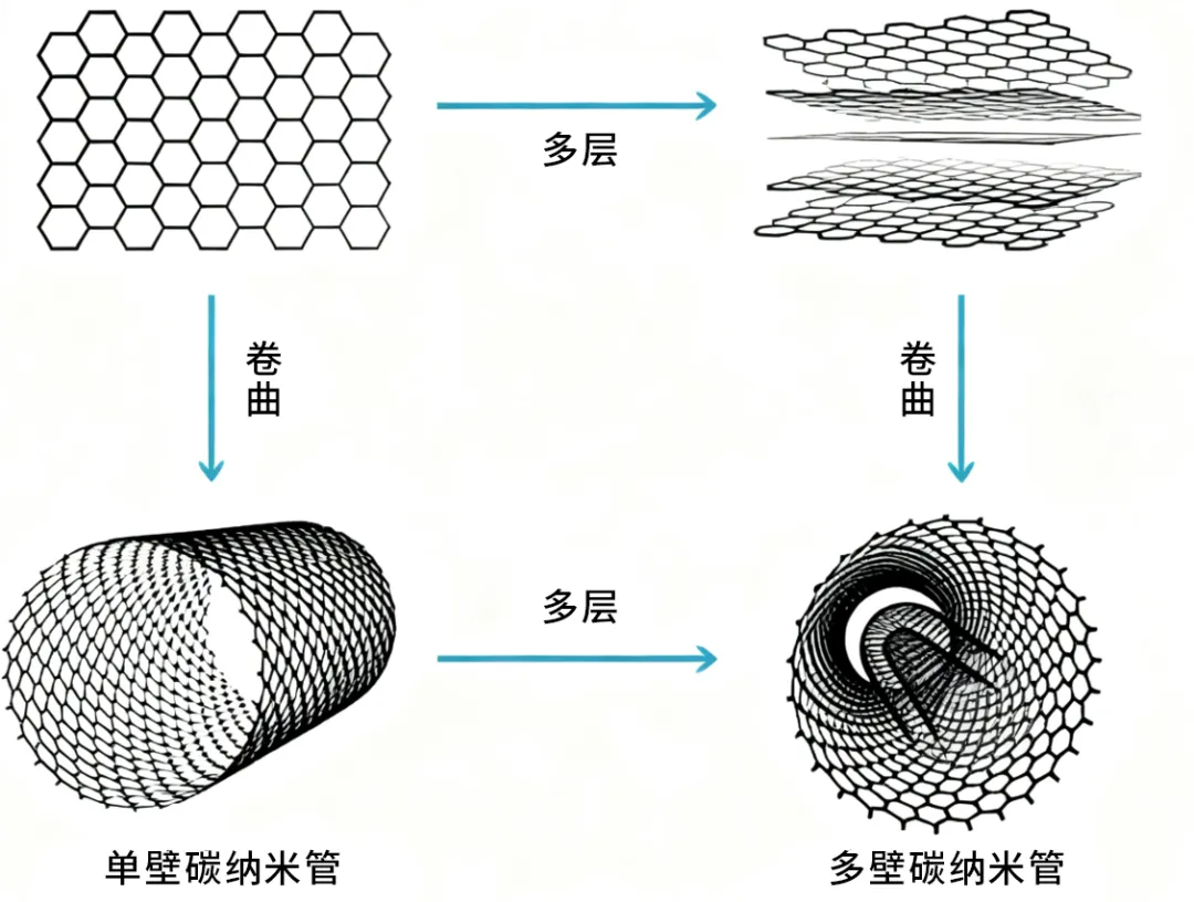 碳纳米管(Carbon Nanotubes, CNT)是由单层或者多层石墨烯无缝卷曲而成的中空管状结构。根据结构可分为单壁碳纳米管(SWCNT)和多壁碳纳米管(MWCNT)。
