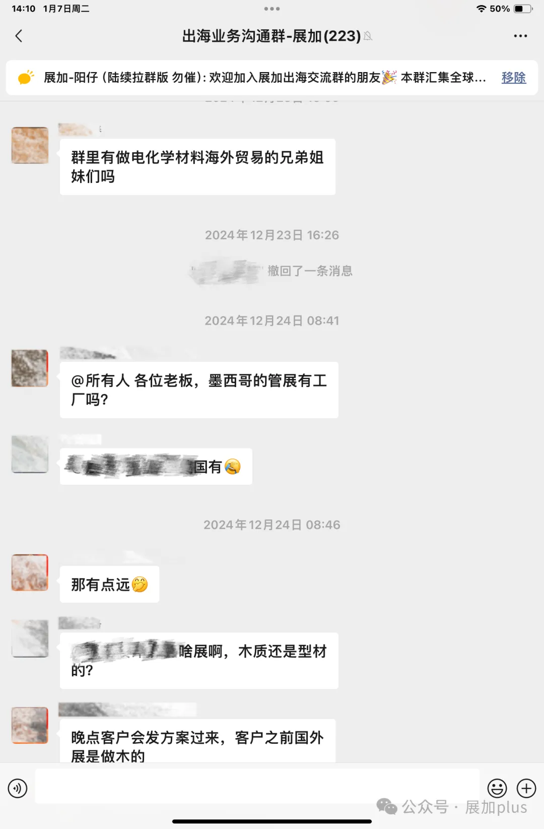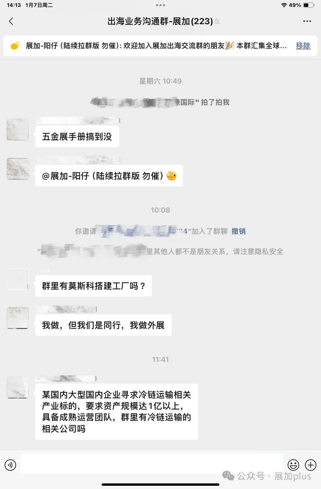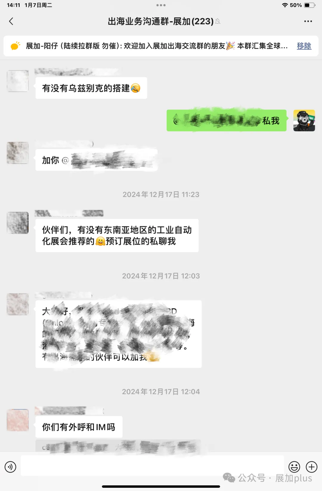 现在,展加微信社群已聚集2万多名好友,包含展会交流群、展会主办群、出海交流群、客户开发群等类型。