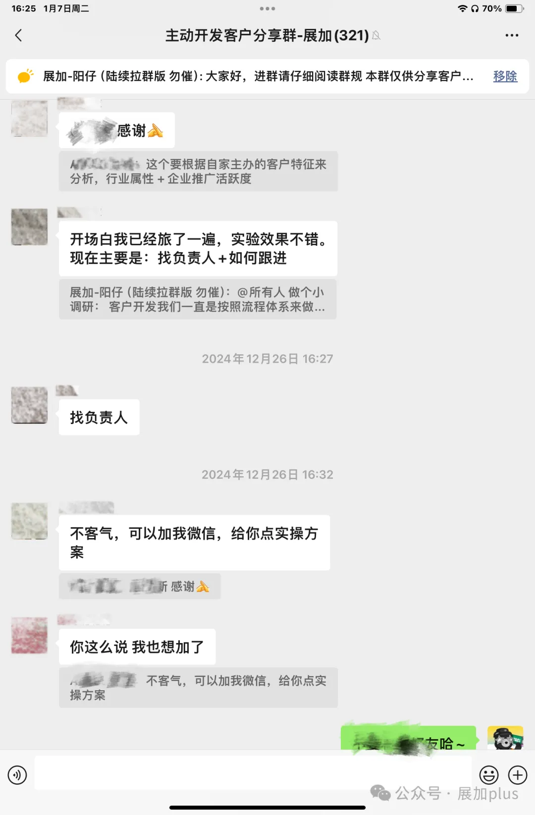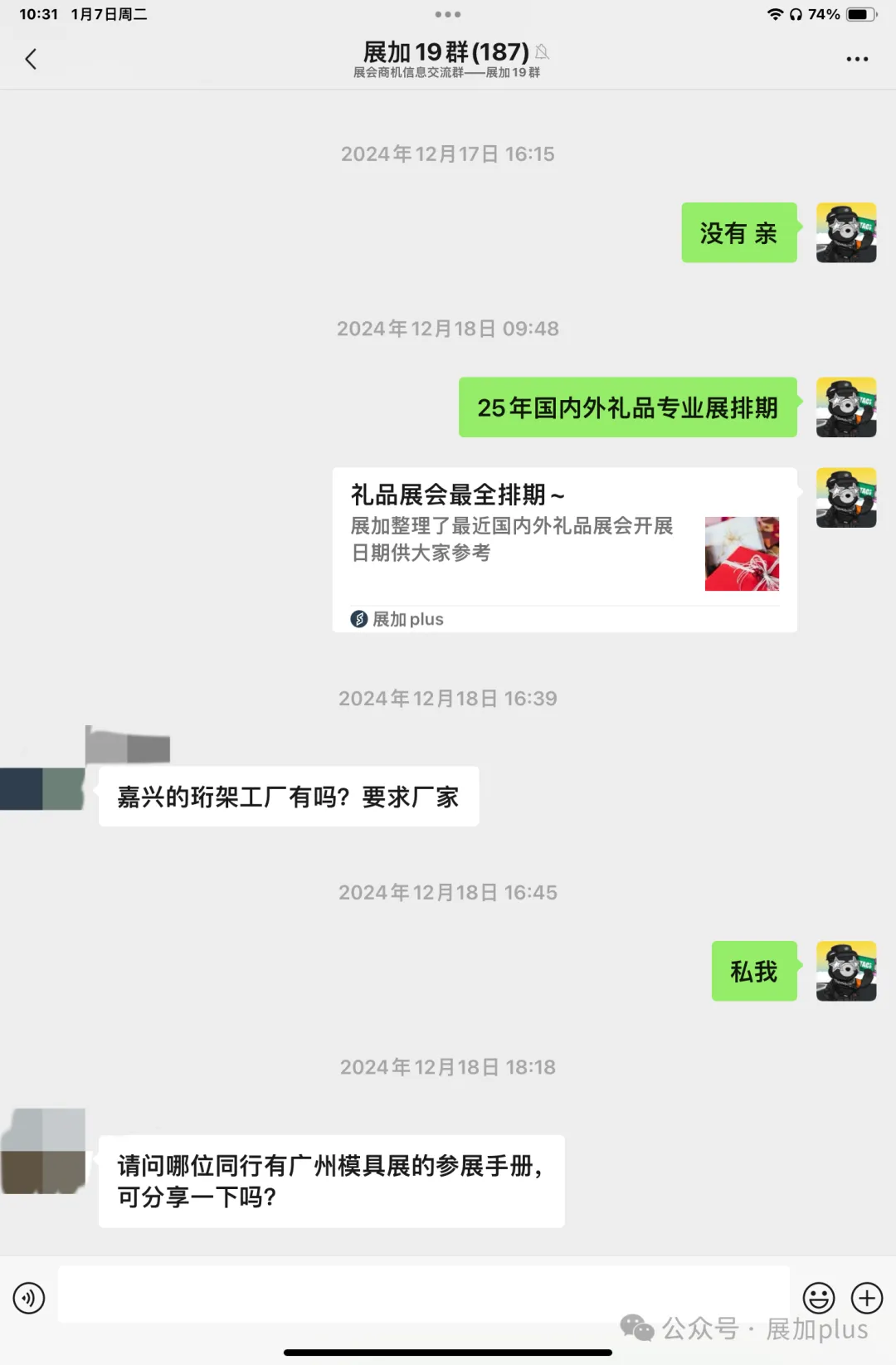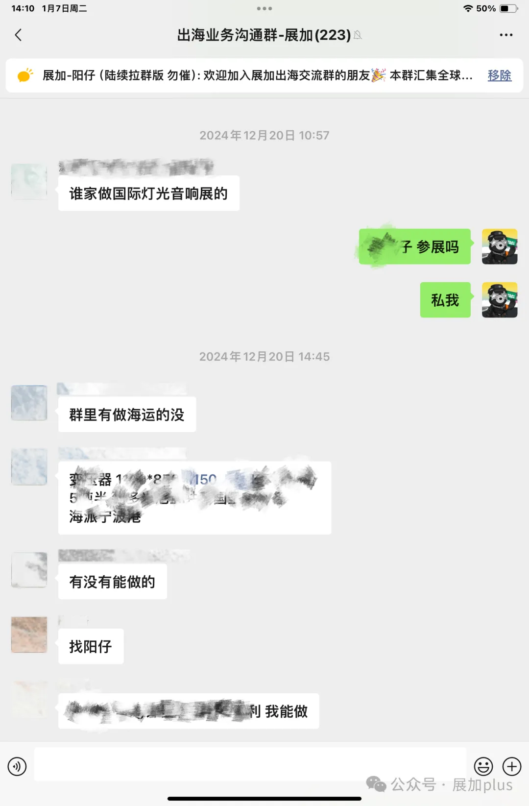 现在,展加微信社群已聚集2万多名好友,包含展会交流群、展会主办群、出海交流群、客户开发群等类型。