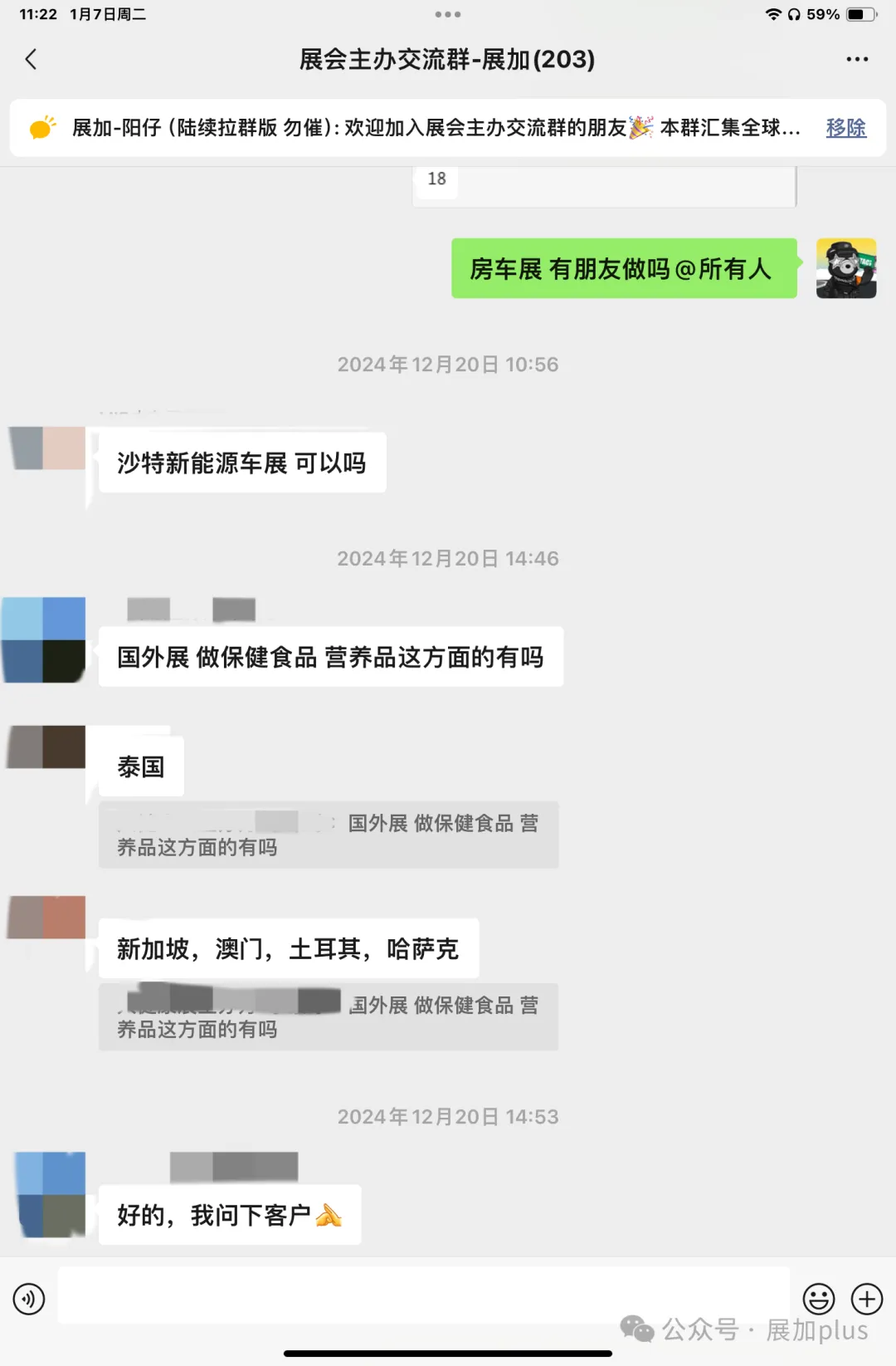 加入社群,能迅速掌握每天最新的展会资讯、展会排期、合作需求;