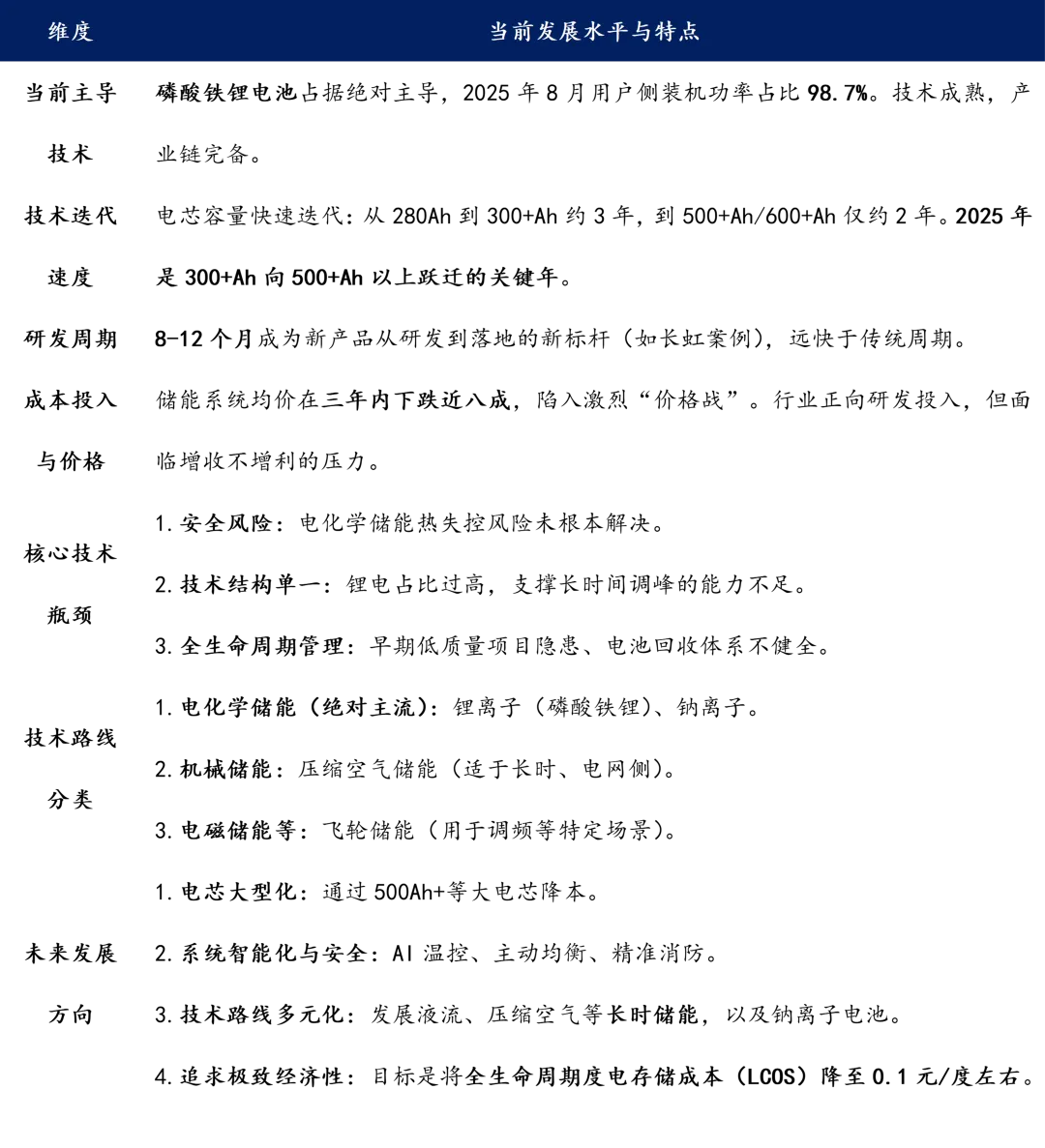 当前储能的主导技术仍是以磷酸铁锂电池占据主导地位,其技术成熟且产业链完备,新兴技术尚未成熟或应用场景相对单一。未来技术将向电芯大型化、系统智能化与储能长时化持续演进。