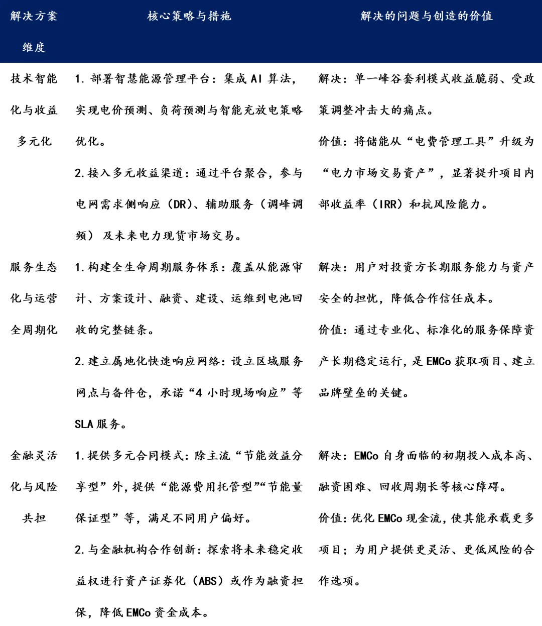 合同能源管理(EMC)模式是当前工商业储能市场渗透的核心引擎。为了克服政策波动、收益单一和信任建立等核心痛点,行业已发展出一套从技术、服务到金融的系统性解决方案。